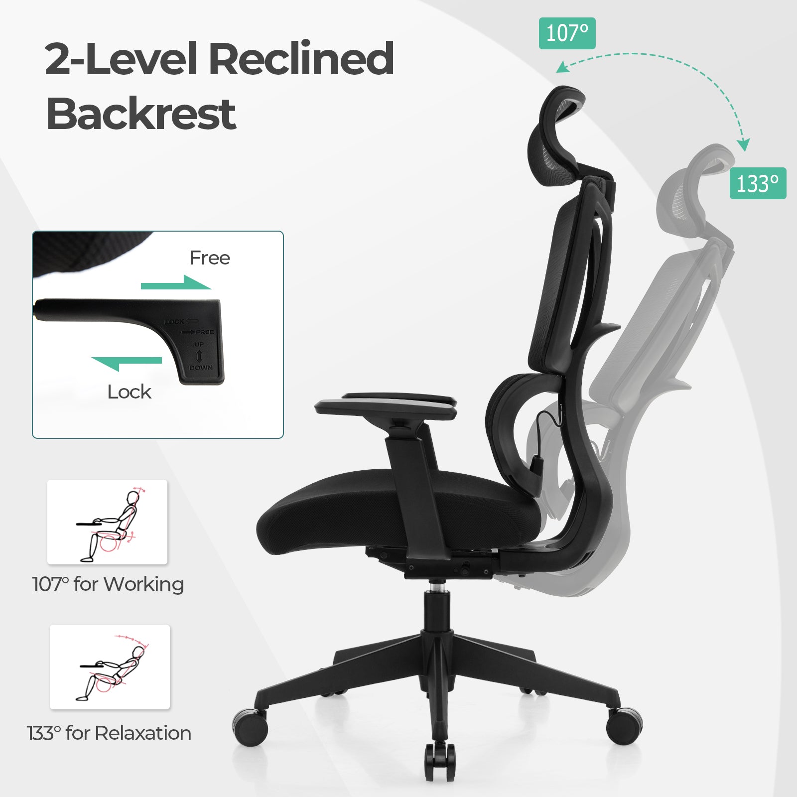 -46"-50" adjustable height is designed for people of different heights-With a 360° swivel seat for convenient conversations in different directions-With 2-level reclined backrest, 107° for working & 133° for relaxation-Height of the customized headrest with 3.5" adjustable range for different needs-Flexible armrests with 4" adjustable range & also allow for 9 positions-Spacious ergonomic backrest with a scientific design to relieve your back fatigue-N type adaptive waist support for dynamic support to relieve sedentary discomfort-Boasts a waterfall seat to reduce pressure, allowing you to sit more comfortably-Wrapped with elastic mesh fabric that is breathable, wear-proof & long-lasting-Filled with high-density sponge, which is ultra-soft for comfortable touch-Fitted with an adjustment lever for easy "Up", "Down", "Free" & "Lock"-Supported by a stable gas rod & a stable 5-claw base for high stability-Features PU universal wheels for easy moving, which is easy to install-Effortless installation is ensured by the easy-to-understand manual