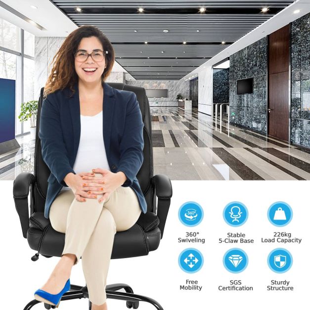 This executive ergonomic chair integrates the wide headrest, humanized lumbar support, thick seat, and padded armrests to provide comfort to relieve the fatigue and pressure of working. 6 vibration massage options for the upper back, lumbar, and thigh gives you more comfortable experiences. The durable PU/PVC leather combines with the high-resilience sponge and high-elasticity coil spring inside to give ultra comfort. The 5-claw base forms a sturdy bottom construction to support up to 226 kg. The 4-stage pneumatic rod is designed for smooth height adjustment. The office chair can rate 360° with low noise and no scratches. A multifunctional and practical computer chair for office workers, friends or students to provide protective support and care! 6 Vibration Massage Function:The executive office chair features 6 powerful vibration motors for the upper back, lumbar and thigh to give you comfortable massage experiences and release the body with less fatigue. Remote control is provided that allows you to set the massage intensityand mode. The armrest on the right has a pocket to put the remote control. Ergonomic High Back Chair: The ergonomic S-shape design comes with a high back, integrated headrest, padded armrests that are close to the curve of body and helps to reduce strain on your waist and back. The wide seat can relax your hip to feel all-day comfort. The executive chair is designed to enhance the sitting position to avoid the stiffness and pain of workers' necks and backs. Soft Leather Office Seat: The high back office chair is made of PU/PVC leather, selected sponge, and spring package filled inside to ensure high resilience and density. Soft premium leather and pad for armrests. It is designed to resist deform, fading, and scratches for your prolonged sitting. The office chair is waterproof with smooth leather surfaces for easy cleaning. Easy Adjustment and Sturdy Construction: The seat height is adjustable according to personal needs. The 4-stage pneumatic rod can withstand more pressure to go up and down smoothly. The back rocking function is for you to relax. You are capable of getting your desired posture and fulfill different needs easily. The stable and sturdy base construction can bear a 226 kg capacity. 5-Claw Base and 360° Rolling Casters: The massage computer chair is equipped with a 5-claw base that can evenly disperse the pressure for stability. The casters can be rotated 360° with a low noise and its smooth-rolling lets you feel free to do whatever you want. They provide convenience for all workplaces like home, office, conference room, and reception rooms.