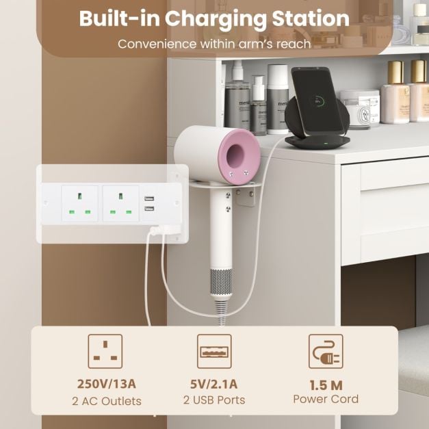 This makeup table featuresa built-in charging station with 2 USB ports and 2 AC outlets for convenient device charging. The HD LED lighted mirror offers adjustable brightness and 3 color options to suit your needs. You can stay organized with ample storage including a jewelry cabinet, drawers, an open shelf and more. This stylish and practical dressing table set makes a perfect gift for loved ones on special occasions, combining functionality and elegance beautifully. Built-in Charging Station:Thecharging stationis equipped with2 USB port and 2 AC outlets.It allows you to charge your devices while you get ready, bringing you ultimate convenience within arm’s reach. HD LED LightedMirror:The lighted mirror features 3-color LED lightswith adjustable brightness(20%-100%) andtouch button, offering warm yellow, warm white or cool white lighting according to your needs. Large Storage Capacity:Your space will stay organized with ajewelry cabinet, a cabinet with a 3-level adjustable shelf, an open storage shelf, 3 drawers and a hair dryer rack. Table dimension: 90 cm x 40 cm x 135 cm (L x W x H). Enhanced Jewelry Organization:The jewelry cabinet is equipped with 64 ring slots, 7 hooks for bracelets and necklaces, 36 earring slots and 36 earring stud holes, providing a discreet and organized space to store your valuables. Stylish and Ideal Gift:Perfect for personal use or as a thoughtful gift for your wife, daughter, or friends on special occasions, this dressing table setserves both practical and decorative purposes beautifully.