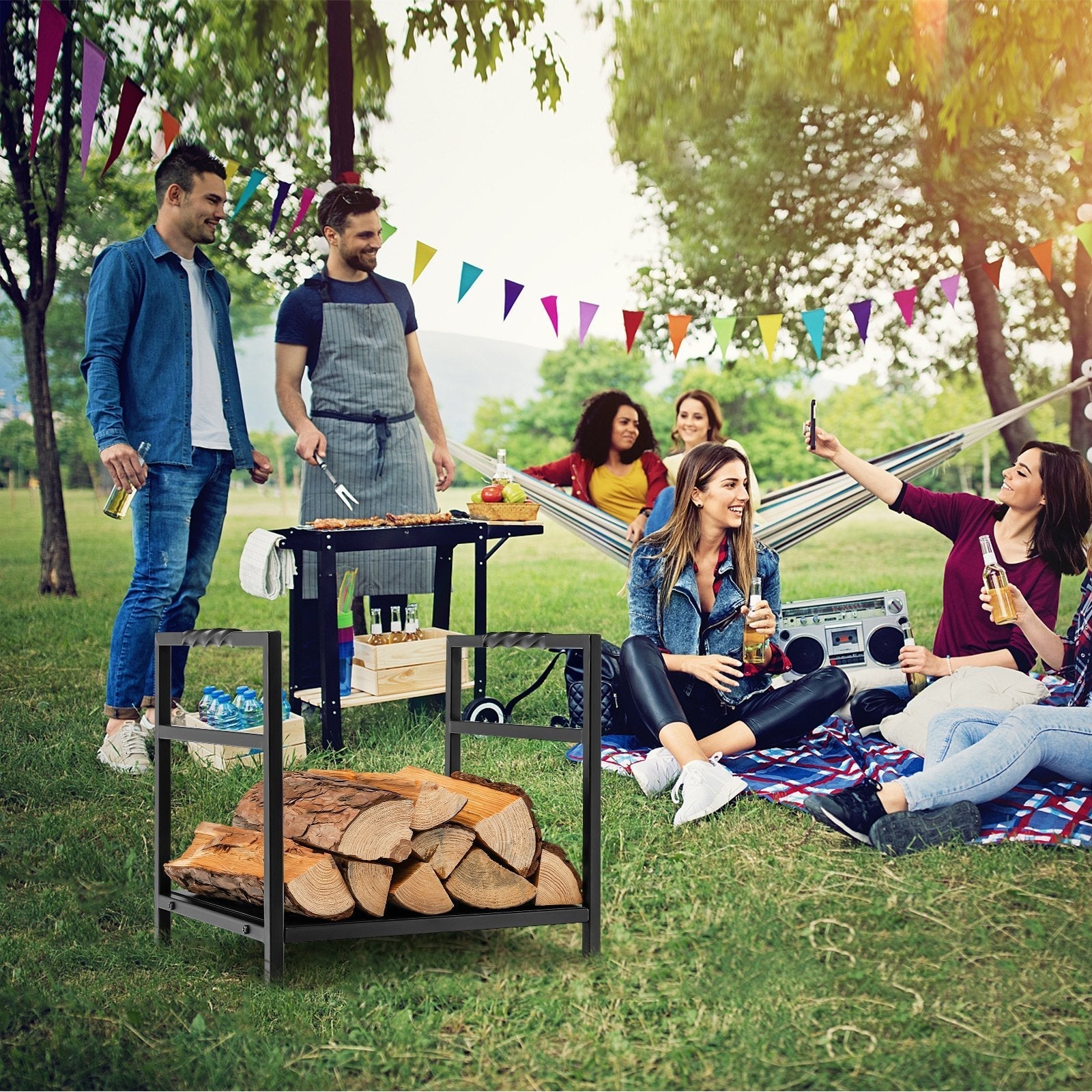 Firewood Log Rack with Solid Bottom Panel and Screw Thread Handle-Black