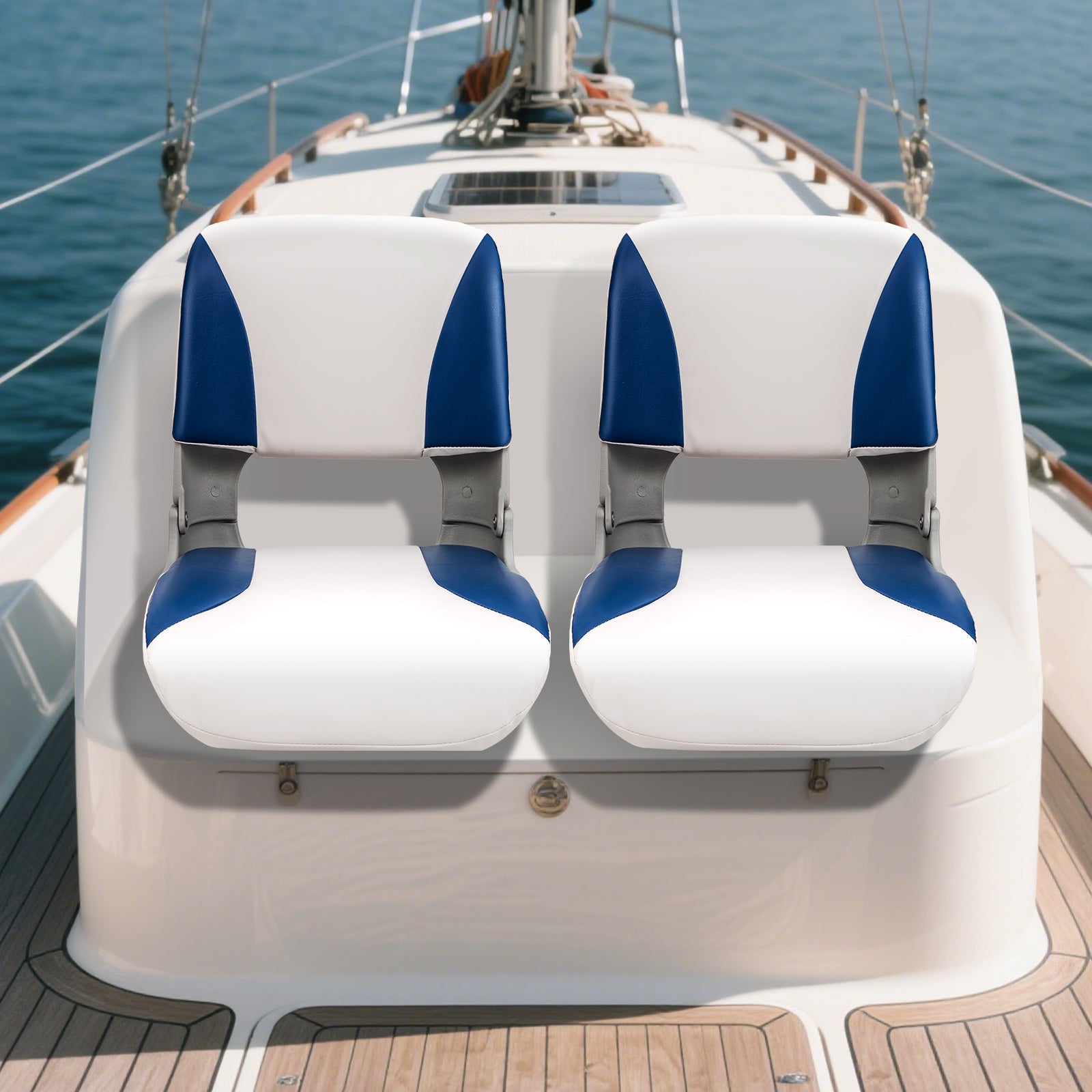Are you seeking a boat seat that offers unbeatable comfort? This padded boat seat provides a high-density sponge cushion and a supportive backrest for ultimate relaxation. Made with premium artificial leather, it is wear-resistant and waterproof, perfect for various outdoor activities. Besides, with a lightweight design and easy folding capability, this chair is ideal for different watercraft and ensures convenient storage. Enjoy stability and strength with a wide seat, sturdy base, and a weight capacity of 150kg. Upgrade your boating experience with our top-quality boat seat. Comfy Padded Boat Seat: The seat and backrest of the padded boat seat are filled with high-density cushion, which offers you a comfortable sitting experience. The slanted backrest provides strong back support and reduces your strain. Portable and Foldable Design: Designed for convenience, this boat seat features a foldable backrest that flips up for a compact size. This makes it easy to carry and store, perfect for on-the-go adventures. Reliable Material and Stylish Appearance: Crafted with premium artificial leather, this captain boat chair is sun-proof and fade-resistant. The waterproof cover adds durability and is easy to clean. Plus, it is also designed with elegant blue and white textures for a chic outlook. Wide Application and Easy Installation: This boat seat fits most support bases and is compatible with a wide range of watercraft, including sightseeing boats, fishing boats, kayaks, ski boats, or speedboats. Plus, the mounting screws are included for easy assembly. High Load Capacity and Dimensions: This marine sitting chair boasts a wide seat and sturdy base, offering an impressive weight capacity of 150 kg. Its overall dimensions are 49cm x 46cm x 48cm (L x W x H), allowing you to place it directly on other chairs or platforms.
