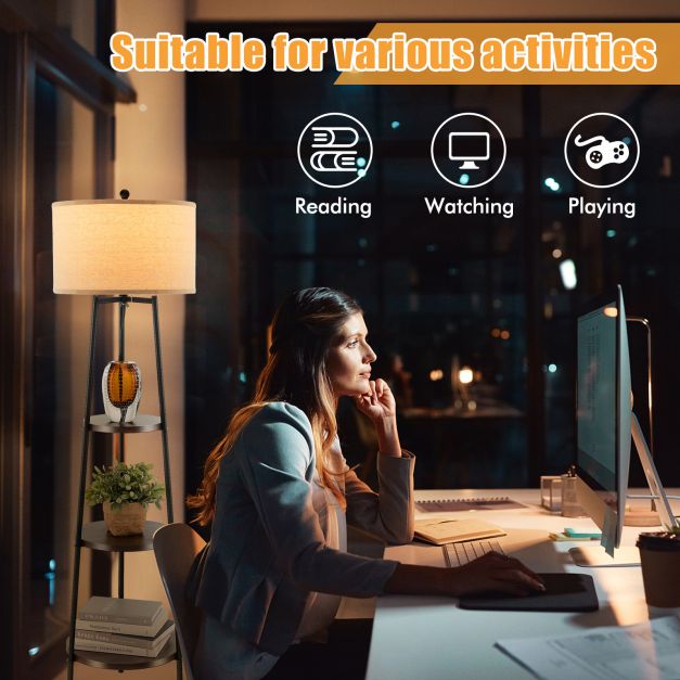 This floor lamp features an E26 socket base that is convenient for you to attach compatible bulbs (not included), whether LED bulbs, incandescent bulbs or CFL bulbs. After that, the durable linen lampshade makes the light soft and gentle for eye protection and a warm atmosphere. Under the lampshade, there are 3 open shelves which create ample storage space for different items, making them fully visible. From an appearance point of view, this display standing lamp establishes a modern addition wherever you put it in the living room, bedroom or office. Versatile Usage with 3 Tier Shelves: Equipped with 3 layer open storage shelves, the corner floor lamp offers ample storage space for kinds of items. You can make full use of them as a bookshelf, or as a display shelf to keep decorations, potted plants, storage baskets within easy reach. Eye Protective Linen Lampshade:With high quality beige linen lampshades, the light of the trapezoid lamp will be softened to create a warm and comfortable environment for you, ideal for family chat. At the same time, the soft lighting protects your eyes and is suitable for reading, studying or working. Compatible with Multiple Bulbs:This standing lamp comes with an E27 socket base that is compatible with most E27 bulbs (bulbs not included), such as LED, incandescent or CFL. Hence, you can customize your own lights according to your preferences. The light can be easily turn on/off with a pull chain. Minimalist and Stylish Floor Lamp: The standard lamp features a unique tower design paired with an elegant linen lampshade for a stylish and simple look that complements a variety of furniture styles, thus tall lamp will be an eye-catching addition in many places, such as your office, study, living room or bedroom. Space Saving Design andMore Details: Thanks to a space-saving 2-in-1 design, our reading lamp will maximize the utilization of your space and make your room look neat and spacious. Plus, the standing light is equipped with wire storage clips to reduce clutter.
