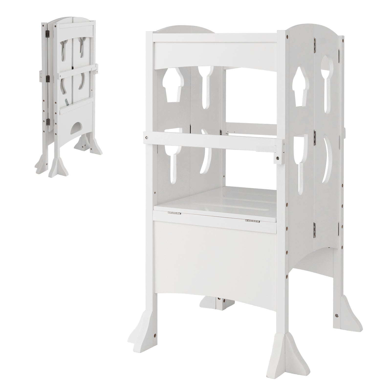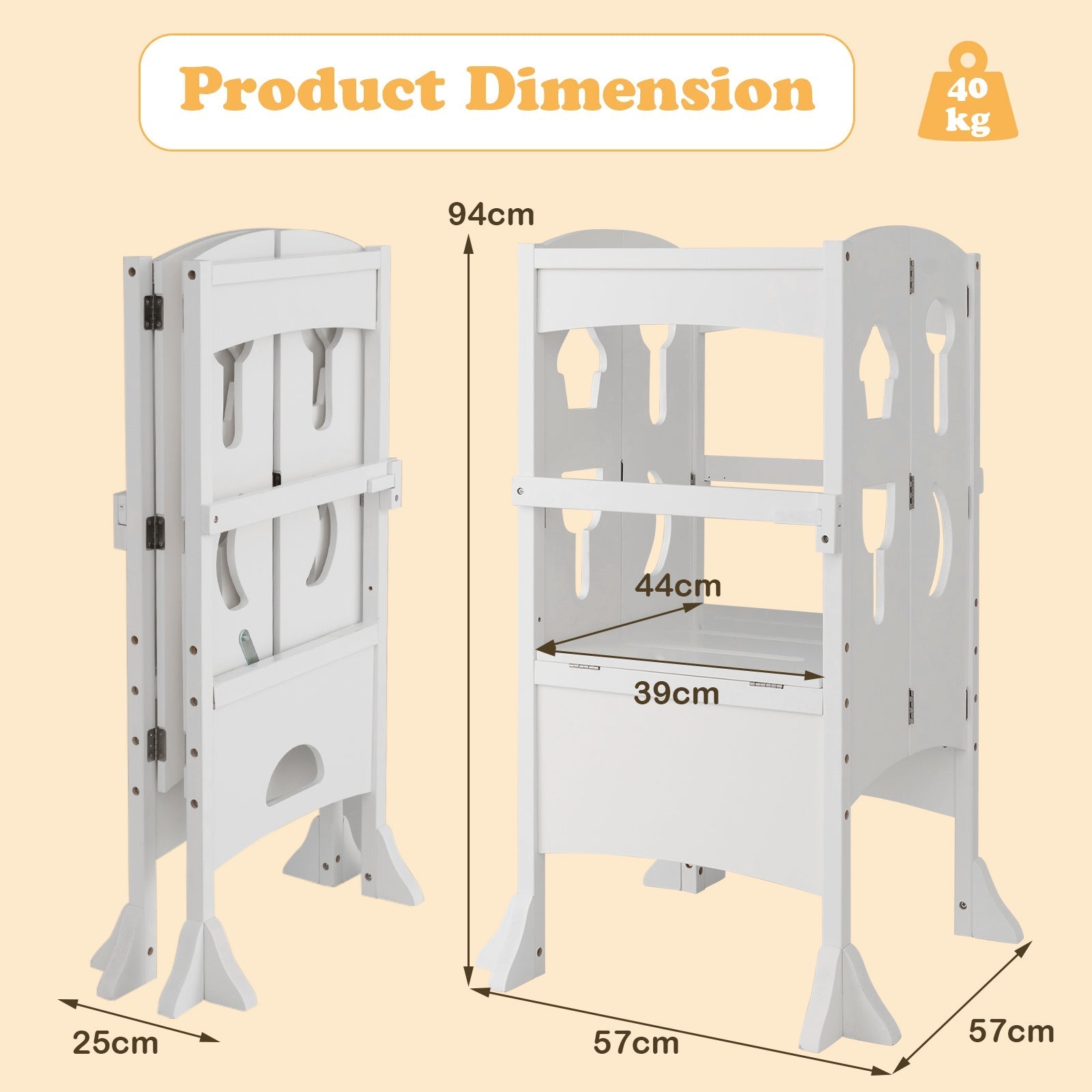 This folding step stool will be a great helper for your little ones, It helps to lift your kids up, so that kids from 3 to 10 years old can step on it to conveniently brush teeth, wash hands, bake or cook. Besides, to ensure your baby's safety, we equip it with 4-sided rails, locking bar and safety latches. Thus, kids can safely climb up and down in the kitchen, bathroom or dining room. Meanwhile, 4 stable feet guarantee overall stability. If needed, you can easily fold it into narrow shape and store the folded step stool in any corner. Adjustable Height for Growing Kids: The toddler standing tower is specially designed with 2-position adjustable platform, which is an ideal choice to accompany your child to grow. Parents are allowed to effortlessly adjust the platform according to their needs. Convenient to Expand & Fold: With folding function, our toddler standing is super easy to expand and fold down. After expanding this step stool, you can use the safety latch for better fixation. When not in use, it can be folded into space-saving shape for easy storage. Its folded size is 57 cm x 25 cm x 94 cm (L x W x H). Offers Multiple Safe Protection: Full-surround guardrails protect kid's safety. The unique locking design avoids accidental falling. Apart from that, thanks to 4 stable feet, our kid's step stool keeps steady and is not easy to wobble when your children climb up and down. Multi-purpose Kid's Step Stool: Our multifunctional toddler step stool elevates children to higher height, which brings kids much convenience in their daily life. This standing tower can be used in the bathroom or kitchen to help your kids to brush teeth, wash hands, reach for items and enjoy cooking fun with parents. User-friendly Design & Easy Assembly: Beautiful carton pattern attracts kid's attention. Smooth surface ensures easy cleaning. What's more, it comes with complete hardware and detailed user manual for easy installation. The unfolded dimension is 57 cm x 57 cm x 94 cm (L x W x H). Plus, its load capacity is 40 kg.