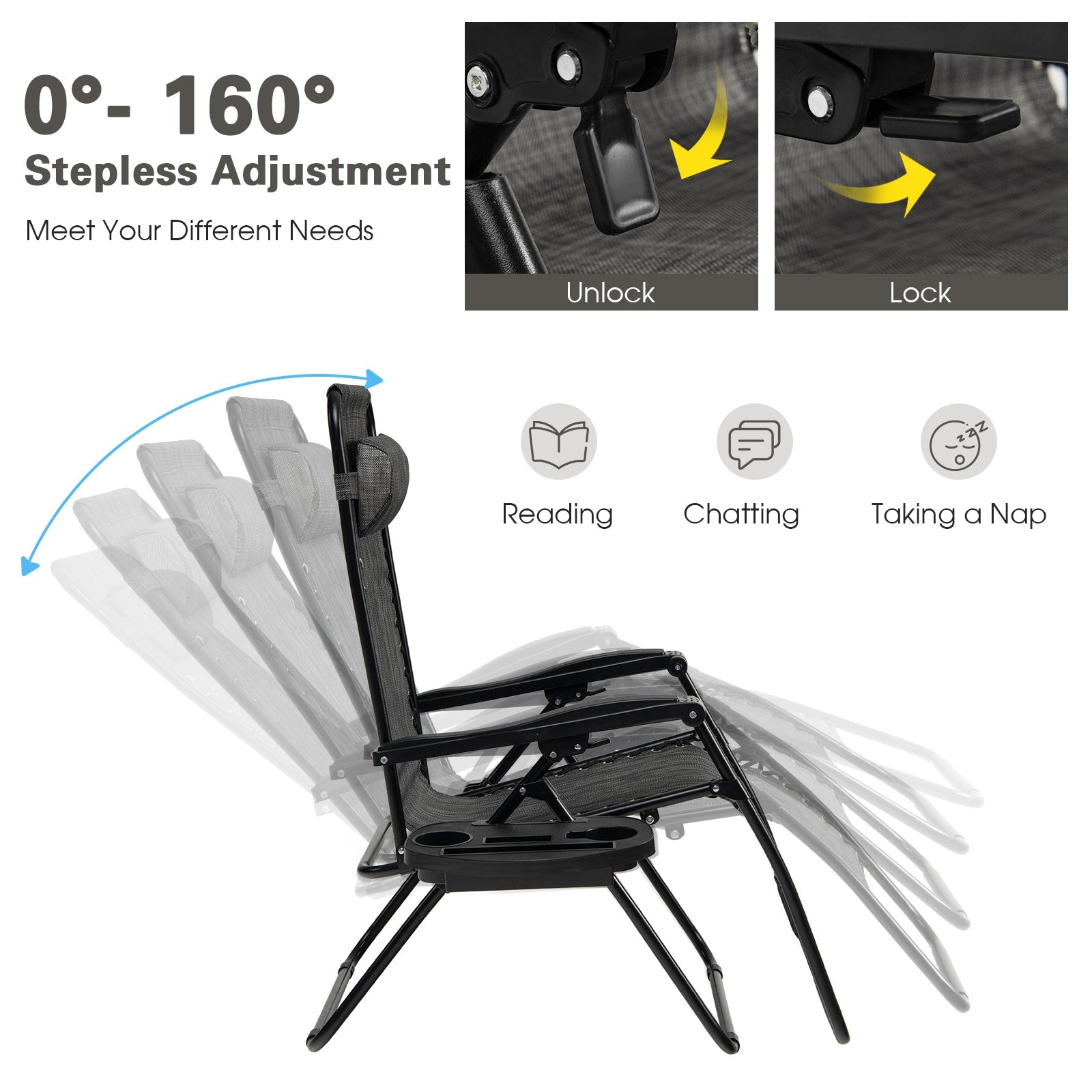 Ergonomically designed with soft padded headrests, breathable fabric and high-elastic bungee ropes, these patio lounge chairs provide a cozier sitting experience. And the special stress-free weightless feel allows you to relax completely. If you sit for a while and want to take a nap, just adjust and lock at a suitable angle. Before napping, you can put your tablet, phone and drinks on the holding tray. What’s more, whether you sit or lie on these patio chairs, the sturdy steel frame with anti-slip foot pads will always keep stable for safety. After using these outdoor recliners, you can fold them for easy movement and storage. Lockable Outdoor Recliner: These zero gravity chairs feature 0° - 160° adjustments to meet your different needs, such as reading, chatting and taking a nap. When you find the appropriate angle, the locking system helps you securely hold that angle. And the ergonomic zero-gravity design and the breathable fabric with high-elastic bungee ropes provide ultimate coziness. Removable Holding Tray and Headrest: The included holding trays can accommodate 1 tablet, 1 mobile phone and 2 drinks separately, making them within reach. In addition, based on your preference, they can assemble on the left or right for great convenience. And the pillows can be adjusted up and down to serve as headrests or lumbar pillows. Sturdy Construction: These outdoor patio recliners are supported by heavy duty steel frames with the rustproof surface that come with strong loading capacity and high durability. Moreover, the sturdy triangular structures and anti-slip foot pads add additional stability. Foldable and Portable Design: These adjustable reclining chairs can be easily folded into compact sizes that are easy to move and store. Therefore, no matter whether you want to use them in the backyard, camping or beach, these outdoor chairs are always on the go. No Installation Required: To save your precious time, these patio zero gravity chairs do not need to assemble. When you receive the package, just take them out and unfold them. After that, you can start your outdoor leisure time with these comfortable patio chairs.