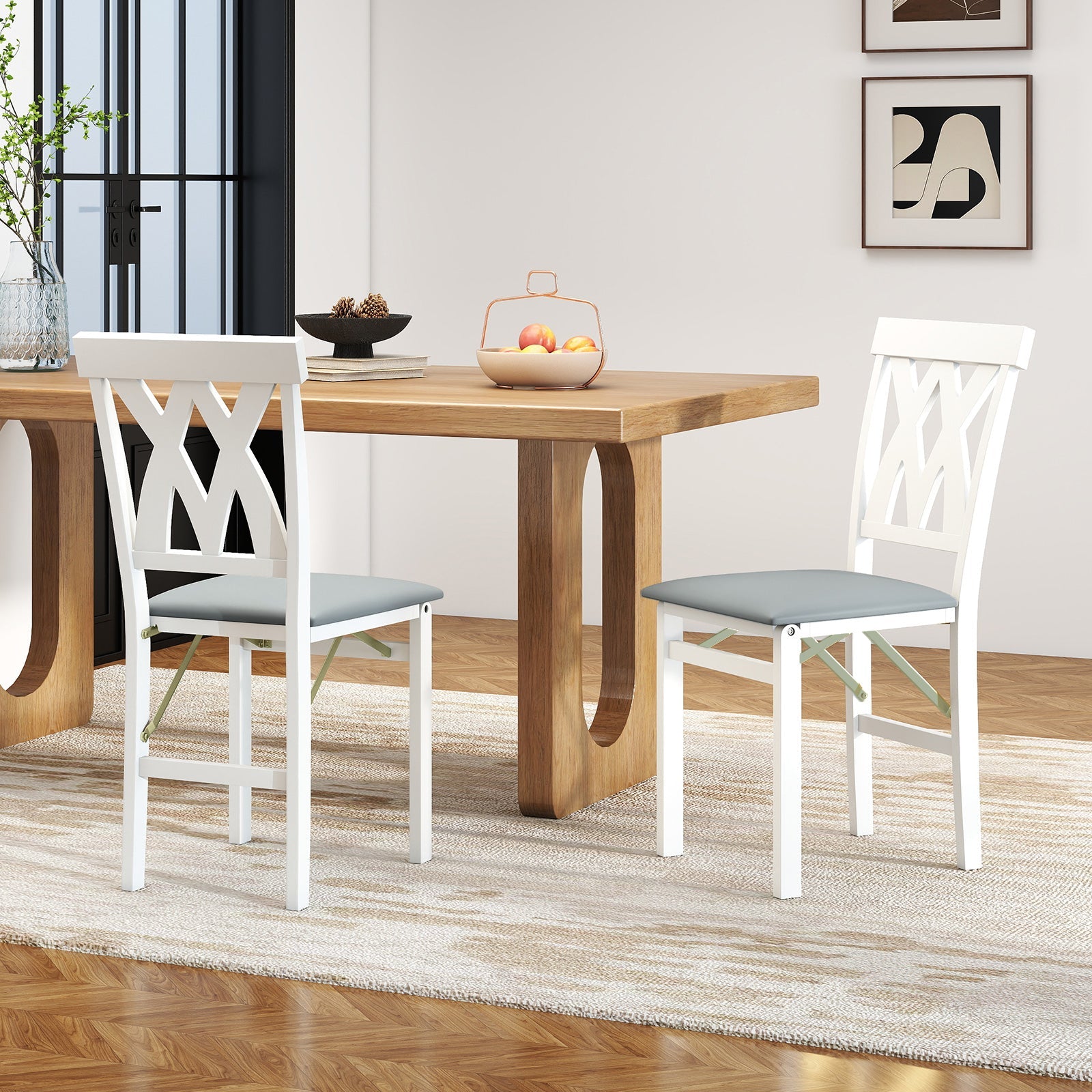 Folding Wooden Dining Chair Set of 2 Faux Leather Upholstered Chairs-White