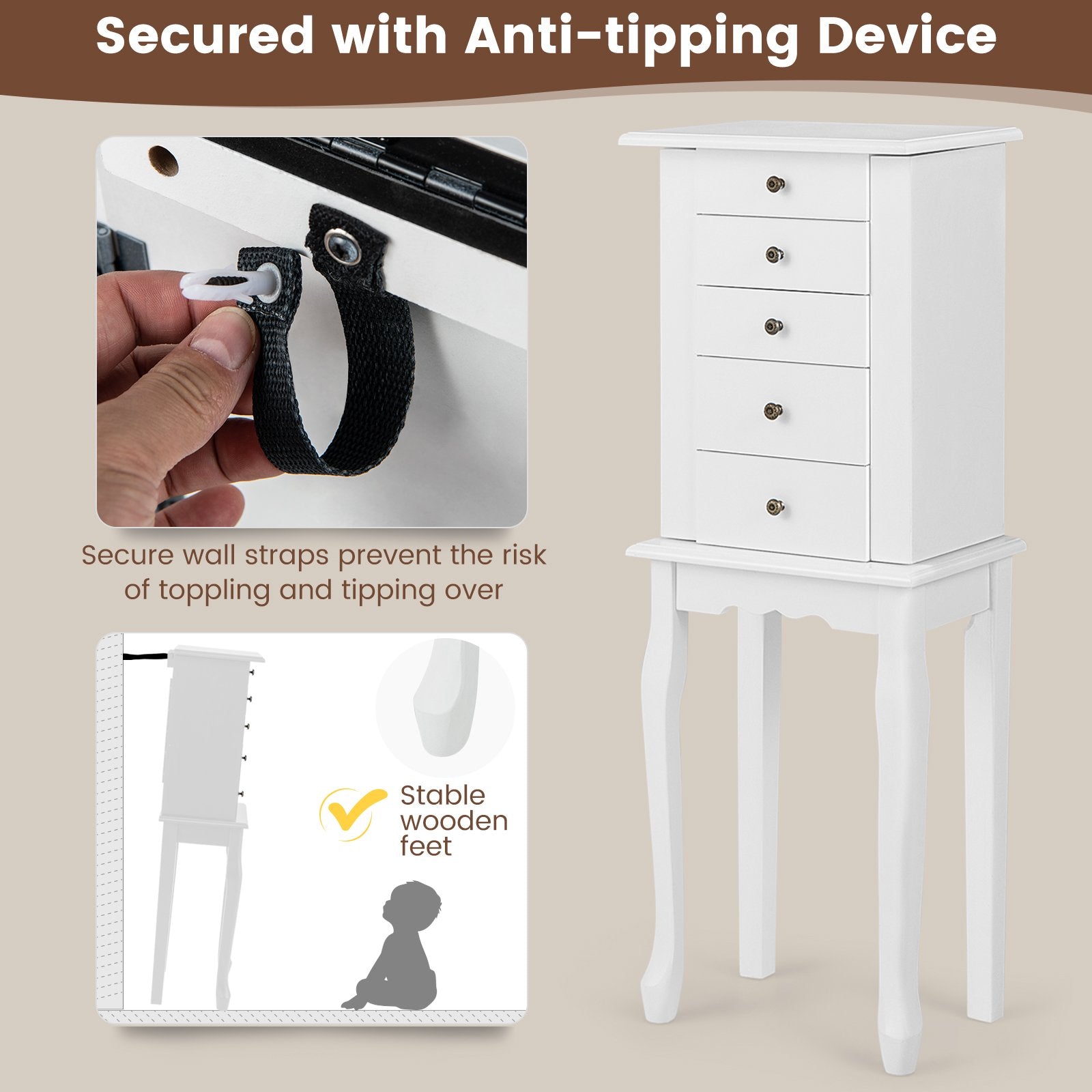 This jewelry cabinet boasts 4 layers and three different types of compartmentalized drawers, offering abundant space to neatly organize your earrings, watches, and various other jewelry pieces. Moreover, enhance functionality by taking advantage of the additional storage space provided by this cabinet. Besides, the side hanger is thoughtfully designed with safety ropes, ensuring effortless and tangle-free storage for your long necklaces. Furthermore, conveniently access smaller items with the discreet hidden storage compartment. Moreover, safety is the priority, which is why this cabinet includes an anti-tipping device and non-slip pads to prevent accidental flipping. Furthermore, crafted from high quality board, this cabinet seamlessly blends style and longevity, making it ideal for everyday use. Multi-Use Jewelry Cabinet: This 4 layered jewelry cabinet offers ample storage space for your jewelry collection. Moreover, features 3 types of different drawers with slot for rings and earrings, this cabinet ample storage space to organize your various jewelry effectively. Extra Storage Solution: This cabinet includes a flip-up container for easy access to smaller items like rings and earrings. Besides, the necklace holder on the side provides efficient storage of long and short necklaces. Enhanced Stability: Designed with anti-tipping device, this freestanding jewelry armoire secure wall straps prevent the risk of toppling and tipping over. Moreover, the stable wooden feet with non-slip footpads ensures high stability to secure safe storage of your valuable jewelry collection. Multi-Use Jewelry Cabinet: Crafted from premium materials, this jewelry cabinet seamlessly blends into any interior space such as bedrooms, living rooms, dressing rooms, or cloakrooms, adding a touch of elegance to your indoor decoration. Thoughtful Cabinet Details: Designed with convenience in mind, this jewelry cabinet features a built-in vanity mirror, allowing you to effortlessly match your jewelry. And it also includes a secure magnetic door catch, ensuring that your precious collection is safely stored. Additionally, the convenient drawer handles provide easy access your jewelry.
