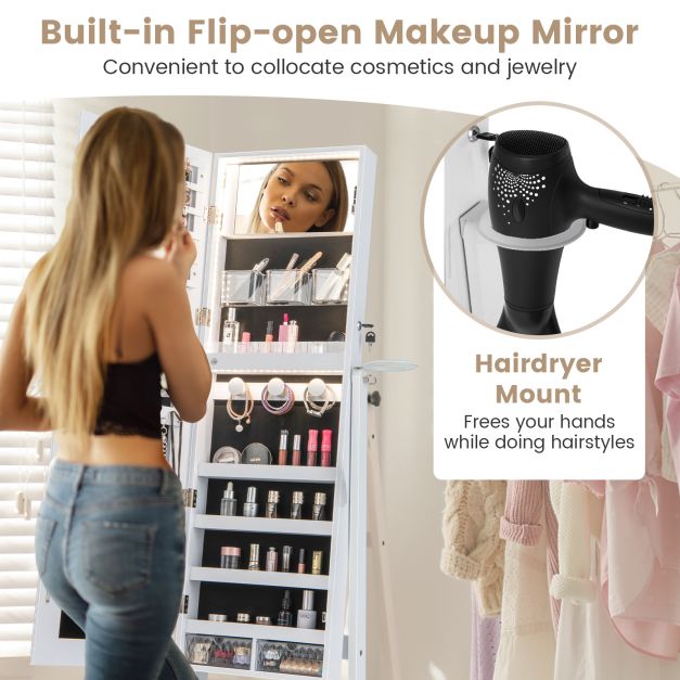 Freestanding LED Mirrored Jewellery Cabinet with Keyhole-White