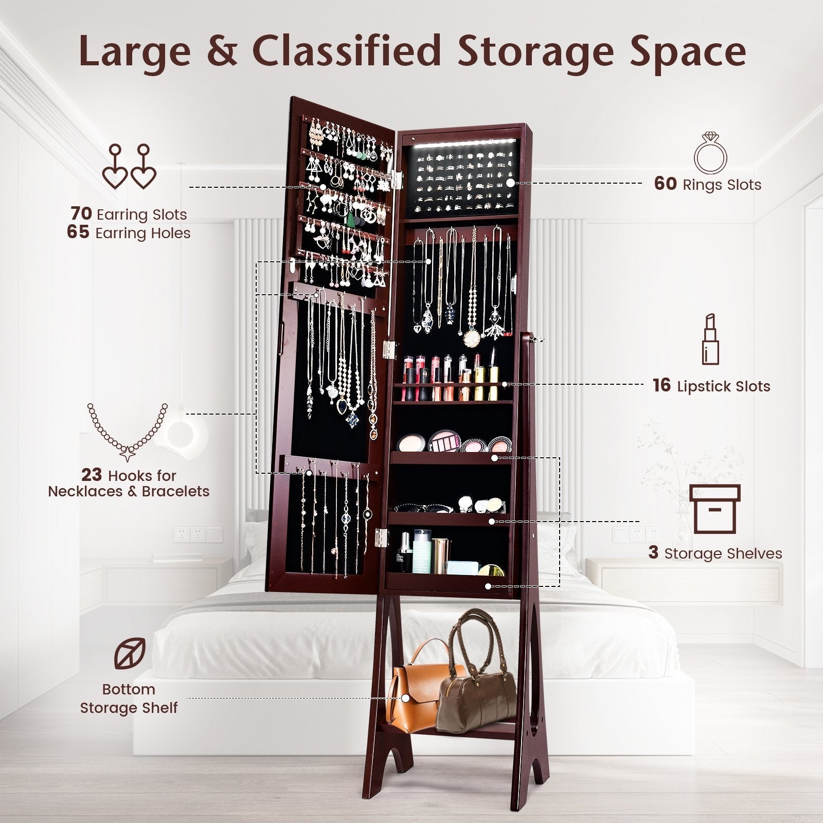 Equipped with full length and frameless mirror, this jewelry organizer will be a great addition to limited spaces like entryway, maximizing the space efficiency. Also, the inside space of the jewelry cabinet is built with slots, hooks, shelves and more, providing large and classified storage space for jewelry and cosmetics. The bottom storage shelf is suitable for placing frequently-used handbags or other accessories. Built in 12 auto-on LED lights, you are able to find what you want easily. The mirror features 3 adjustable tilt angles, easily adjustable according to your needs. Made of premium MDF and metal hinges, the jewelry organizer is capable of long lasting service. Full Length Mirror with Adjustable Angles: This jewelry cabinet combines a full length and frameless mirror, which can offer you a clear and full body image during dressing up. More importantly, the mirror can be easily adjusted in 3 tilt angles, which allows you to find the desired angle during trying on. Keep All Your Belongings Well Organized: This jewelry armoire is equipped with 70 earring slots, 65 earring holes, 23 hooks, 60 ring slots, 16 lipstick slots and 3 storage shelves, which is enough for all your jewelry and cosmetics. Moreover, the bottom is built with a storage shelf for placing handbags or other accessories. Built in LED Lights and Magnetic Door Catch: The jewelry organizer is built in 12 LED lights that will turn on automatically when the door is open, convenient for you to find desired jewelry or cosmetics even in the dark. Note: requires 3 AAA batteries (not included). The magnetic door catch can close and secure the door, avoiding dust accumulation. Stable Structure and Premium Material: Made of high quality MDF and premium metal hinges, the jewelry storage cabinet is endurable for long time use. Besides, the triangular feet provide ample support to the jewelry cabinet and ensure a stable center of gravity, not easy to knock down by accidents. Easy Assembly and Wide Application: Coming with detailed instructions and required accessories, the assembly is no longer troublesome. You will quickly obtain a complete mirror jewelry cabinet. Designed in minimalism style, this mirror jewelry cabinet fits to various scenarios, such as bedroom, living room and entryway.