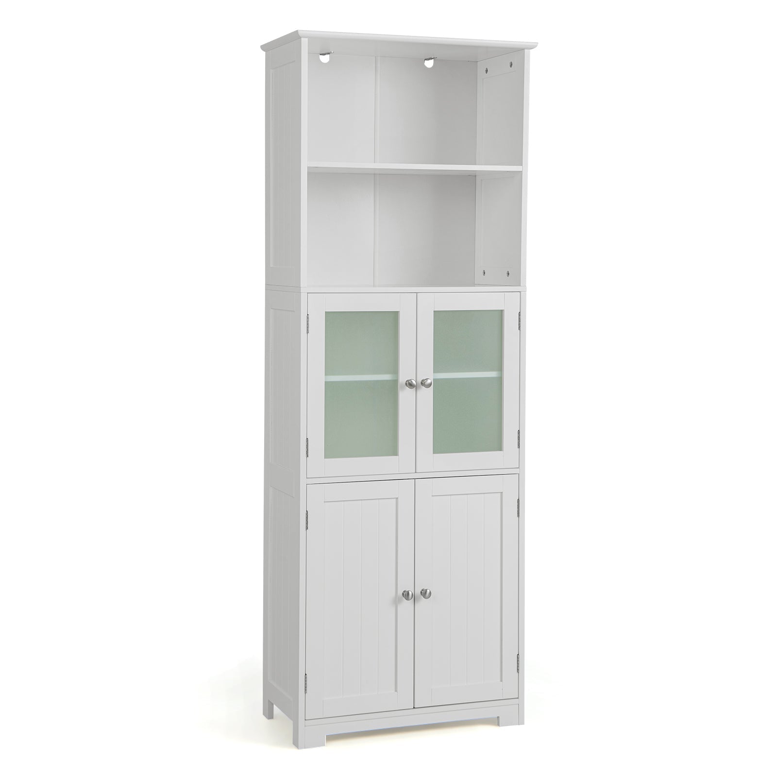2 open compartments and 2 enclosed cabinets with doors & adjustable shelves provide roomy space for holding your shampoos, conditioners, towels, perfumes or other stuff. Apart from that, you can place this cabinet in the kitchen to store kitchen utensils, or in the study room, or living room for books& collections. Made of premium MDF and sprayed with waterproof paint, this bathroom storage cabinet can serve you for a long time. Besides, the back anti-toppling devices are designed for safe use. 4 raised legs keep the cabinet from water immersion and make it easy to clean the floor. If you are looking for a tall storage cabinet like this, do not hesitate to place an order! 6-Tier Enclosed and Open Storage Space: Equipped with 2-tier open storage shelves and 4-tier enclosed storage shelves, this bathroom tall cabinet offers large storage space to keep various items well organized. Besides, there are two 3-position adjustable shelves that allow you to customize interior storage space as you need. Premium Material and Stable Structure: Made of thick and durable MDF with smooth paint, this bathroom storage cabinet can withstand the test of time. And the frosted tempered glass doors are not easily broken for safer use. Meanwhile, the floor cabinet features 2 anti-toppling devices to prevent wobbling or tippling over for added safety. Wide Range of Application: This 163cm tall floor cabinet can keep your home neat and tidy, which is suitable for any room that needs additional storage space. In addition to being used as a bathroom storage cabinet, it can also work as a pantry cabinet/cupboard in the kitchen or dining room or a side cabinet in the living room. Elegant Style and Convenient Use: The pure white finish, sleek lines and stripe design on the sideboard cabinet surface add a touch of beauty and modern charm to this tall storage cabinet. Moreover, the handy round handles and functional magnetic catches help you to open and close the doors with ease. Hassle-free Assembly and Easy Cleaning: This freestanding bathroom cabinet comes with numbered parts and easy-to-understand instructions to make the assembly work a breeze. What's more, the painted surface is easy to wipe clean with a damp cloth and 4 stable raised legs help to clean up the floor easily.