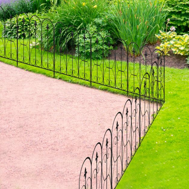 Add the garden fence around flowers and plants for protection. Made of thickened steel and coated with rust-proof paint, the garden fence is strong and weather-resistant to withstand long-term outdoor tests. This garden fence is equipped with five panels, which are independent of each other and can be freely combined into different shapes. Moreover, the side ring of each panel allows you to interlock easily. And the fence legs can be inserted into the soil to complete the installation. Combining the arched design and exquisite embellishment patterns, this fences have a charming appearance and will add extra beauty to your garden. If you are looking for a garden fence like this, do not hesitate to place an order! Flexible Installation Combinations: The garden fence is composed of five panels, each of which can be interlocked with a hole on the side to be tightly connected. And they can be expanded into various shapes according to your special purpose for this path fence, which can be a straight line, "L", "O" or zigzag shape. Portable Fence with Detachable Design: Our garden fence employs a one-step disassembly design, which means that only the fence legs need to be removed from the ground. Beyond that, each panel can be separated independently so that you can split it for stacking storage, thereby minimizing space occupation. Stable and Durable Structure: Made of premium steel with rust-proof coating, the garden fence is weather-resistant and stable, making it suitable for long-term outdoor use. The fence is inserted into the soil to ensure that it penetrates firmly into the soil for better fixation. Multifunctional Fence: This fence size is scientific and can effectively protect your beloved plants from walking damage by children or pets. It is suitable as a decorative fence to be placed in a garden or lawn, or as a road edge for isolation and can even be converted into an animal barrier. Elegant Appearance for Decoration: Comes with arched craftsmanship, the elegant garden fence is harmoniously matched with the outdoor environment, adding a sense of fashion to your garden, terrace, balcony and courtyard. Meanwhile, the exquisite finish in the middle decorates the fence well.
