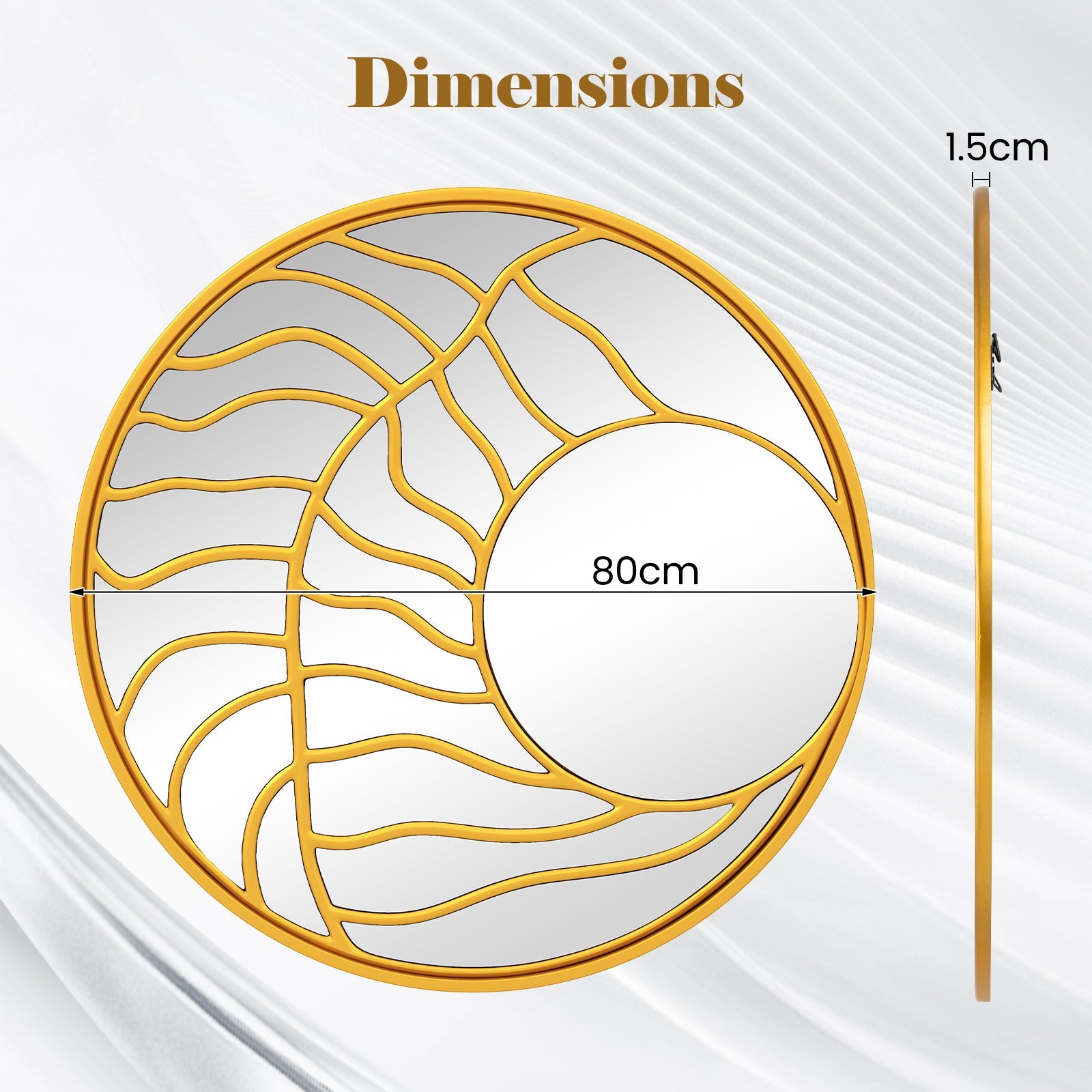 Color: Gold Material: MDF, Glass Product Dimensions: 80 cm (Dia.) Small Mirror Size: 37 cm (Dia.) Thickness: 1.5 cm Shape: Round Net Weight: 7 kg Box Qty:1 Package Includes: 1 x Wall Mirror 1 x Screw Kit 1 x Instruction