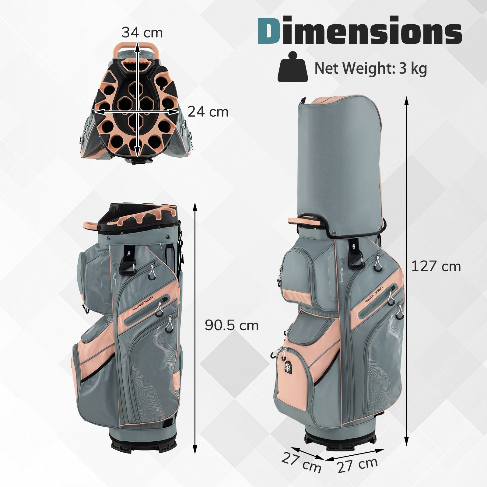 Colour: Black + White/Grey + Dusty Pink/Grey + Navy/Purple + Grey Material: Polyester Fabric, Plastic Bag Height (with Rain Hood): 127 cm Bag Height (without Rain Hood): 90.5 cm Top Dimensions: 34 cm x 24 cm (L x W) Base Dimensions: 27 cm x 27 cm (L x W) Net Weight: 3 kg Box QTY: 1 (May vary by batch) Package Includes: 1 x Golf Cart Bag 1 x Rain Hood