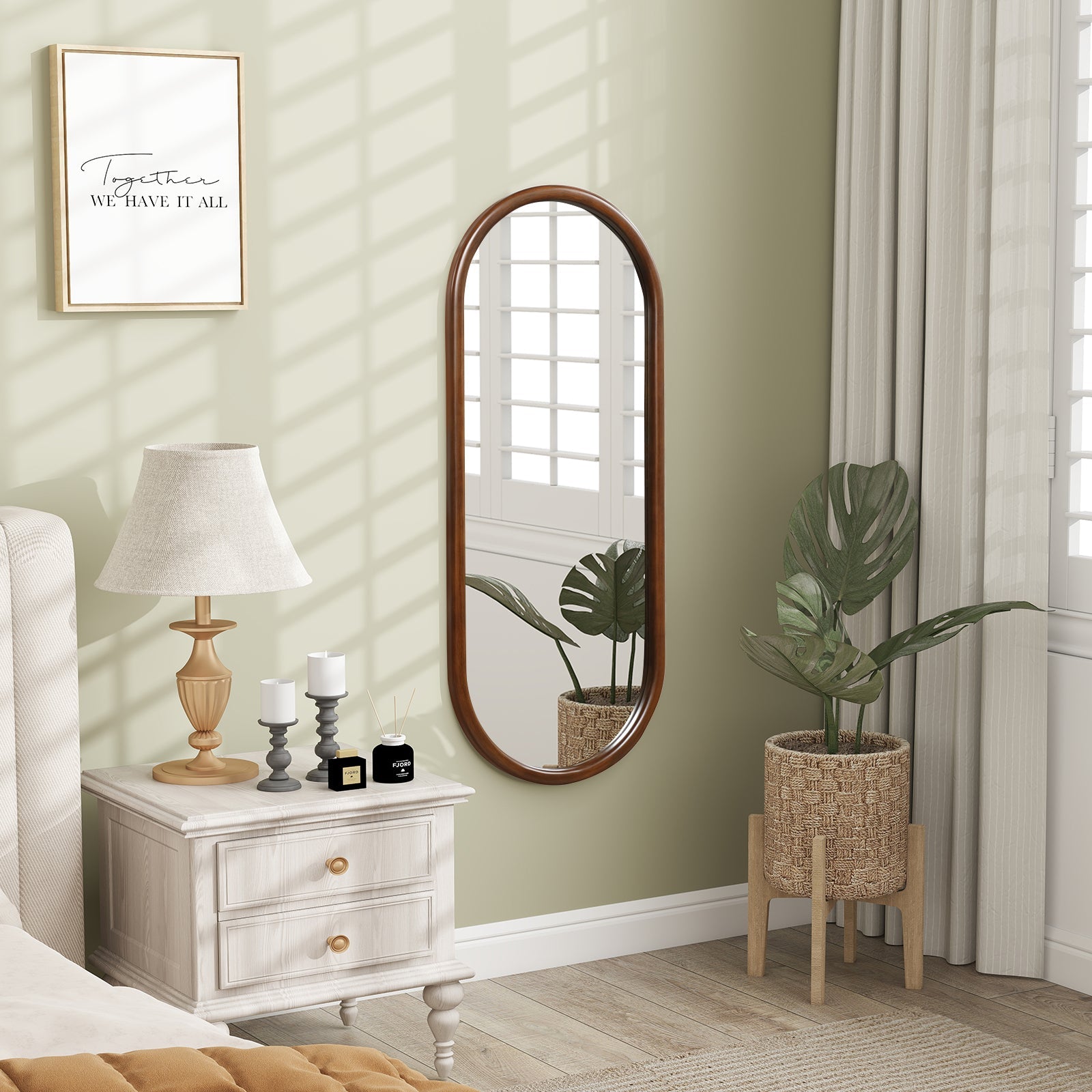 The mirror provides a crystal-clear reflection for flawless daily grooming checks and is engineered for durability with easy-to-clean surfaces. It combines function with elegance, showcasing a solid wood frame that adds a touch of natural sophistication to any room. With sturdy metal hooks on both vertical and horizontal positioning, installation is both secure and simple, ensuring the mirror stays perfectly in place. Its modern and elegant design enhances any space, from your bedroom to your living room or entrance, making it not just a practical necessity but a central piece of decor. Bullet Points:High-Quality Wall Mirror: The hanging wall mirror offers a crystal-clear reflection and is engineered for long-term use. The surface is easy to clean that ensures mirror remains as pristine as the day you hung it up, perfect for daily grooming checks. Solid Wood Frame: Crafted with a high-quality solid wood frame, this oval mirror exudes a rich texture that’s both sturdy and resistant to deformation. The robust build guarantees durability and adds a touch of natural elegance to your decor. Secure Installation: The wall-mounted mirror features 4 strong hanging metal hooks on both vertical and horizontal positioning, ensuring a secure and easy setup. Its reliable mounting system keeps the mirror firmly in place for safe display. Modern Elegant Design: Upgrade your space with this elegantly designed oval-shaped mirror, complemented by a smooth and burr-free solid wood frame. Its sophisticated silhouette adds a contemporary yet classic touch to any room. Wide Application: Measuring 110 x 45 cm (L x W), the versatile mirror is an ideal addition to your bedroom, living room, or entrance. Its generous size and elegant design make it not only a practical choice but also a decorative highlight in any space.