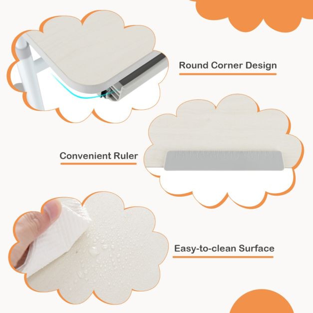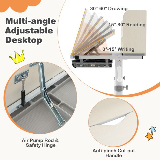 This adjustable kids study desk is an ideal gift for your growing child!This height-adjustable desk is suitable for kids aged 3-12 years, ensuring that it adapts to your child's development through the years. The tilt desktop with 0°-60° adjustable angle encourages proper posture, making reading, writing, and drawing more comfortable. A built-in scale ruler along the desk edge makes it convenient for kids to measure while they do homework. Besides, designed with a hutch and a large drawer, the writing desk provides a perfect storage solution and keeps the study area tidy. The durable materials and sturdy construction ensure years of reliable use, while the smooth round corners enhance safety. Adjustable Height: The tabletop height of this study desk can be easily adjusted between 20"-29" by rotating the lever and fixed by the locking knobs. This height-adjustable desk can grow up with your child and ensure a perfect posture for homework, art projects and more. Multi-angle Adjustable Desktop: The kids desk features a tiltable desktop that provides perfect angles for various activities: writing (0°-15°), reading (15°-30°), drawing (30°-60°). Besides, the anti-pinch cut-out handle, air pump rod & safety hinge ensures handy and secure opening and closing. Large Storage Space: This writing table comes with 2-tier open shelves on the spacious tabletop and a large drawer with dividers below, offering ample space for storing all your child's learning materials, stationery and art supplies. Stable Structure: Crafted from thick boards and solid metal legs, this kids study table with hutch ensures superior stability and durability. Moreover, the bottom adjustable foot pads and the reinforced crossbar between the legs are designed for added stability.Child-friendly Design: The thoughtful addition of a scale ruler along the desk edge assists children with math homework, drawing, and hands-on projects. In addition, the round corner design can effectively protect children from bumps and scratches.
