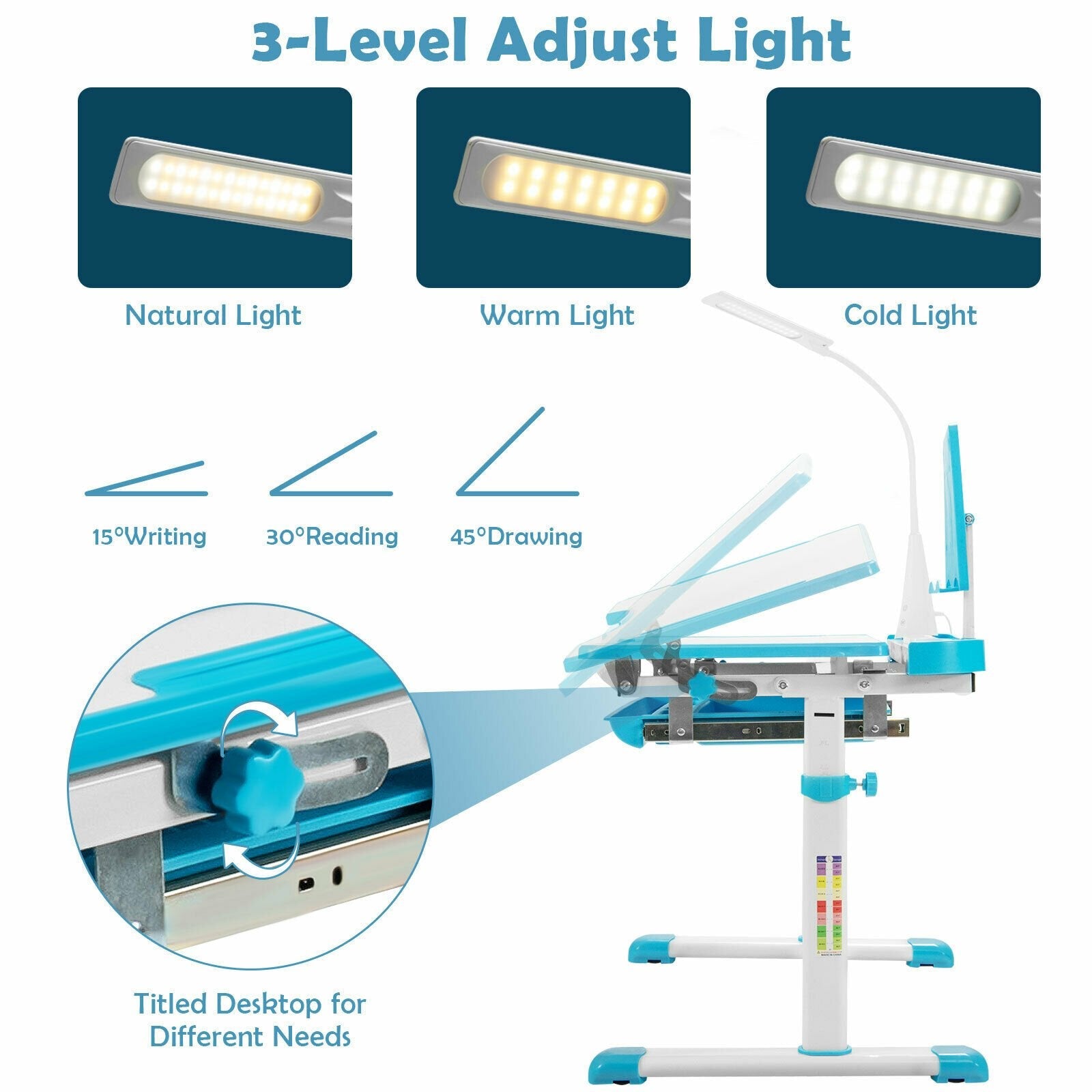 Height Adjustable Kid's Tilted Desk Set with Lamp & Drawer-Blue