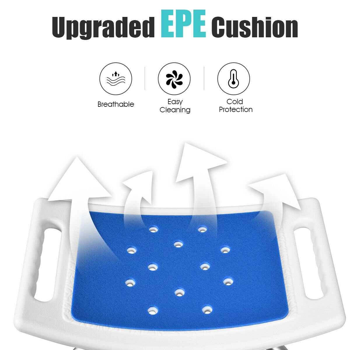 Make your daily routine more comfortable and much safer with this shower stool. The heavy-duty frame, made from high-quality aluminium, is not only lightweight, making it easy to lift and move, but it is also strong. The rubber ferrules make it slip-resistant and stable thus reducing the risk of falling down and creating a safer shower environment. This enables you to sit whilst washing and as it is height adjustable, it is suitable for many different user requirements. The seat is ergonomically designed for comfort and the seat has drainage holes so that water does not collect. Enjoy your shower time with this shower stool! Curved seat with EPE pad provides comfort 6 adjustable heights positions suitable for different user needs Premium aluminium frame, lightweight and stable for easy and safe use 4 anti-slip rubber ferrules hold the stool stable while showering Built-in handles for ease of transport Drainage holes to keep the water from collecting and helps to keep you securely seated. Compact, simple appearance suitable for most bathtubs and showers Easy to assemble with hand screws and detailed instructions, no tools required