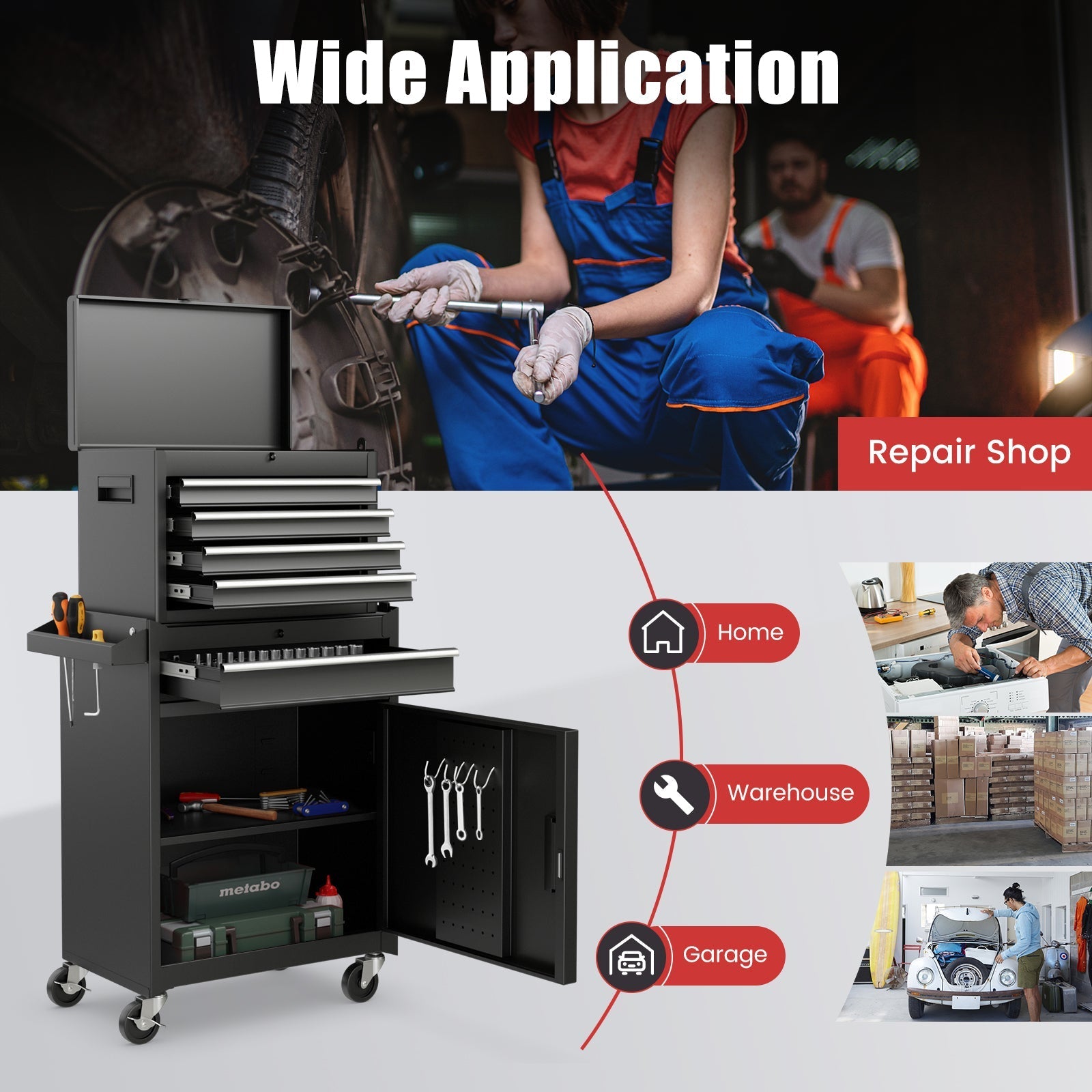 Upgrade your workspace organization with this 5-drawer rolling tool chest. Designed for both convenience and security, this tool storage cabinet features lockable wheels to keep your tools safe while allowing for easy mobility. The adjustable shelf ensures you can neatly organize any tool size and access them with ease. Plus, the removable tool box organizer provides even more customization options. This high-capacity tool chest is built to last with heavy-duty metal which is sturdy and rustproof. You can trust that with this well-designed rolling tool chest, all your tools are well classified and organized. Improve your efficiency with this must-have addition to your workspace! 2-in-1 Detachable Design: The whole tool storage cabinet consists of a removable upper chest and a large bottom cabinet. The upper chest can be detached and put into the bottom cabinet, saving space and meeting more of your demands. Note: please remove the inner shelf of the bottom cabinet first.Perfect Tool Organizer: The upper chest with 4 drawers and a top compartment offers classified storage space for multiple tools. Also, the bottom cabinet with a drawer features a tool hanging board and 3-level adjustable inner shelf for additional storage space.Move without Effort: Equipped with 4 360° swiveling wheels, 2 of which are lockable, the rolling tool chest is much easier to move around. Moreover, the convenient handle on the side is also perfect to store tools.Well-Designed Details: Each drawer boasts smooth drawer slide for easy pulling in or out. Plus, you can fix the drawer lock bar to lock all the drawers without pulling out during moving. The whole cabinet also includes anti-slip liners to keep the items always in place.Wide Applications: This functional rolling tool chest will make all your tools clean and tidy, highly improving your working efficiency. Whether in the tool room, auto repair shop or warehouse, it will always be your practical helper.