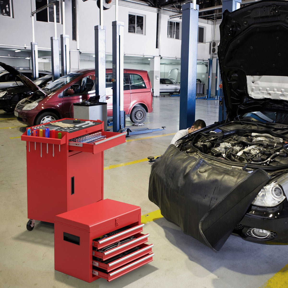 Upgrade your workspace organization with this 5-drawer rolling tool chest. Designed for both convenience and security, this tool storage cabinet features lockable wheels to keep your tools safe while allowing for easy mobility. The adjustable shelf ensures you can neatly organize any tool size and access them with ease. Plus, the removable tool box organizer provides even more customization options. This high-capacity tool chest is built to last with heavy-duty metal which is sturdy and rustproof. You can trust that with this well-designed rolling tool chest, all your tools are well classified and organized. Improve your efficiency with this must-have addition to your workspace! 2-in-1 Detachable Design:The whole tool storage cabinet consists of a removable upper chest and a large bottom cabinet. The upper chest can be detached and put into the bottom cabinet, saving space and meeting more of your demands. Note: please remove the inner shelf of the bottom cabinet first.Perfect Tool Organizer:The upper chest with 4 drawers and a top compartment offers classified storage space for multiple tools. Also, the bottom cabinet with a drawer features a tool hanging board and 3-level adjustable inner shelf for additional storage space.Move without Effort: Equipped with 4 360° swiveling wheels, 2 of which are lockable, the rolling tool chest is much easier to move around. Moreover, the convenient handle on the side is also perfect to store tools.Well-Designed Details:Each drawer boasts smooth drawer slide for easy pulling in or out. Plus, you can fix the drawer lock bar to lock all the drawers without pulling out during moving. The whole cabinet also includes anti-slip liners to keep the items always in place.Wide Applications: This functional rolling tool chest will make all your tools clean and tidy, highly improving your working efficiency. Whether in the tool room, auto repair shop or warehouse, it will always be your practical helper.