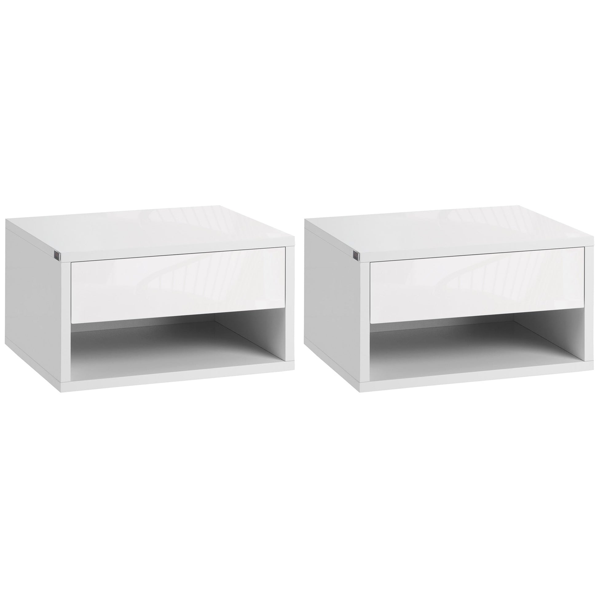 HOMCOM 2 Pieces Bedside Table Wall Mounted Nightstand with Drawer and Shelf for Bedroom, 37 x 32 x 21cm, High Gloss White