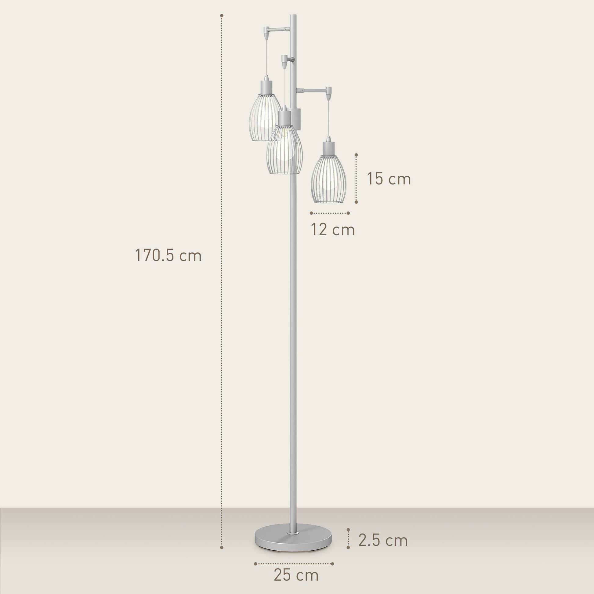 Bring industrial style into your home with this HOMCOM tall lamp. It features three lights for three lots of illumination - they can dim to create your own ambience. The silver tone cage shades create style. It's made from steel, so this industrial floor lamp is strong - with a round base to keep balanced. Transform your space instantly. For screw bulbs - maximum 40W.