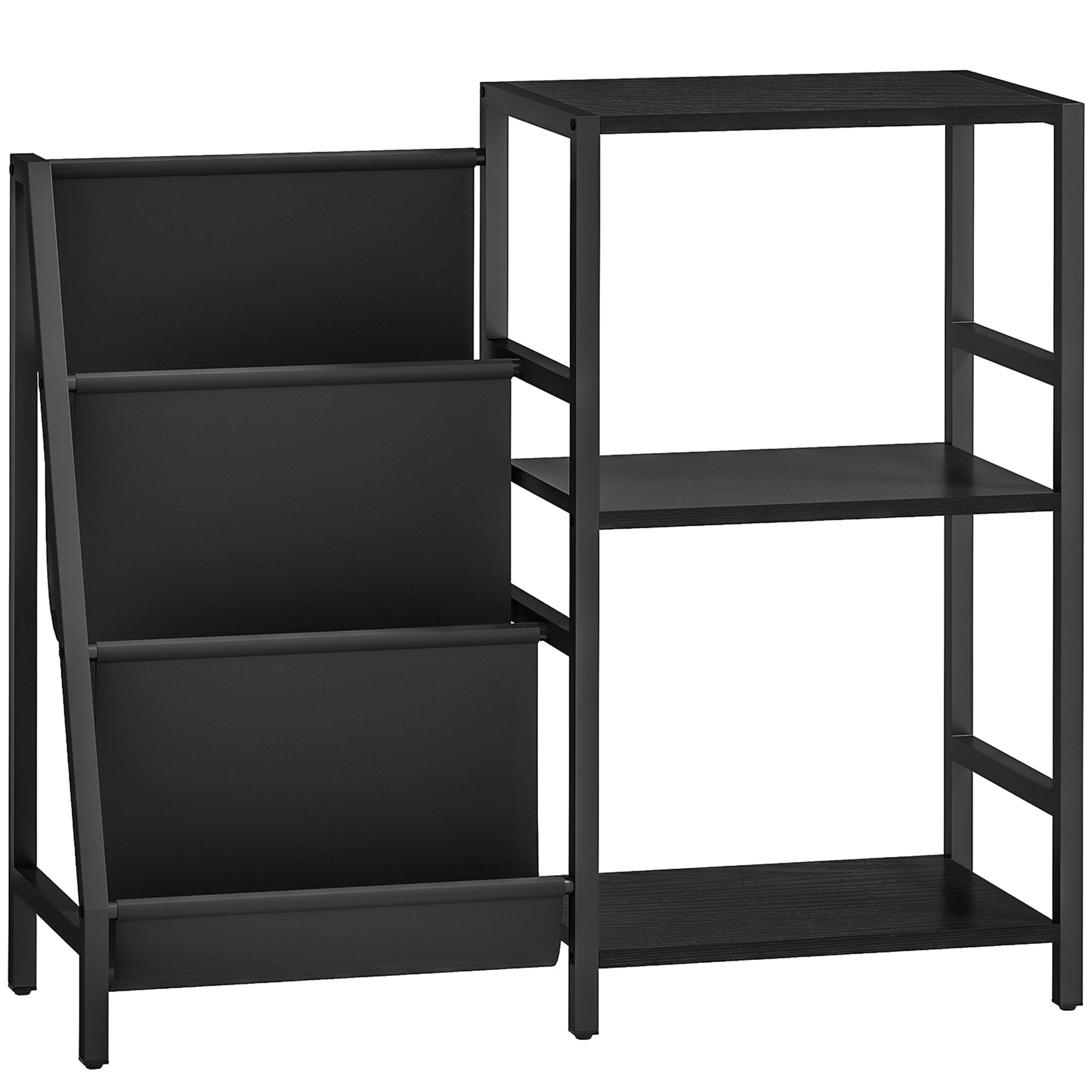 - Three shelves and three Oxford cloth racks keep books and magazines organised