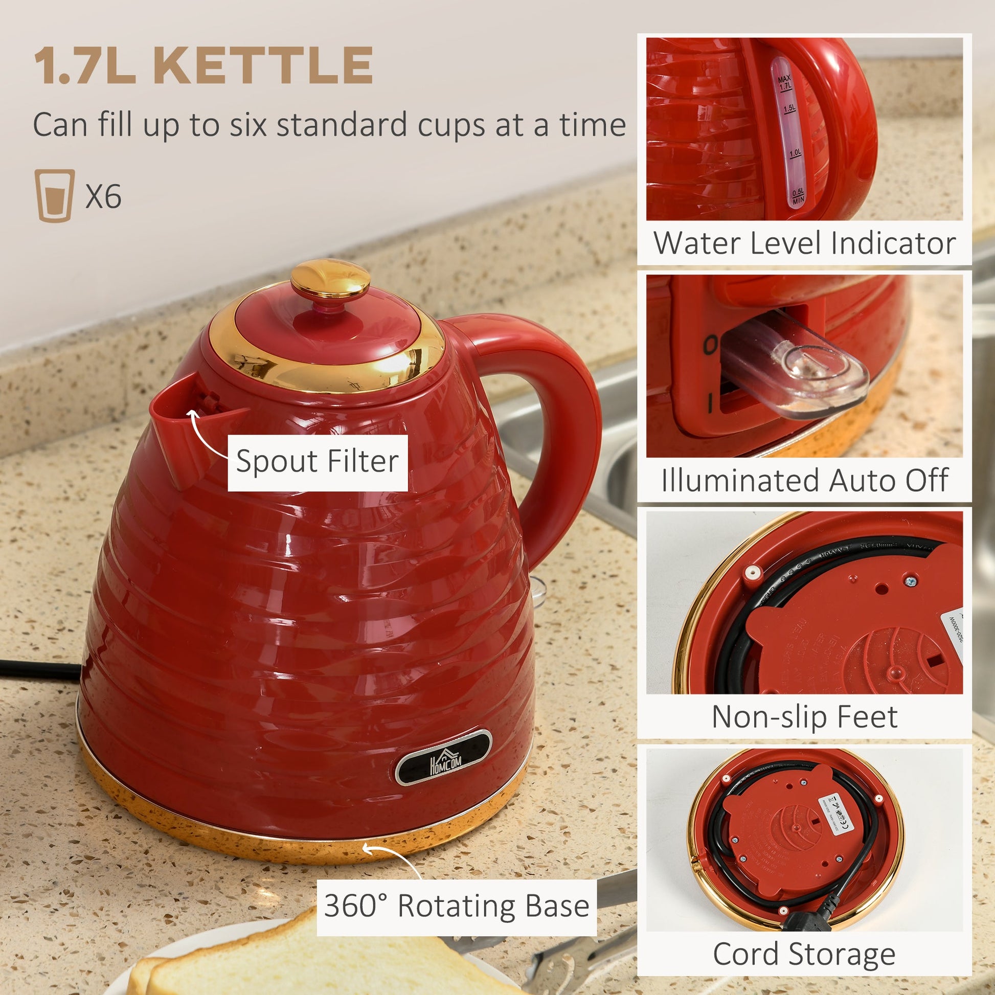 غلاية هومكوم 3000 وات سعة 1.7 لتر سريعة الغليان ومحمصة 4 شرائح ومجموعة غلاية ومحمصة مع 7 أدوات تحكم في التحميص وصينية فتات، أحمر