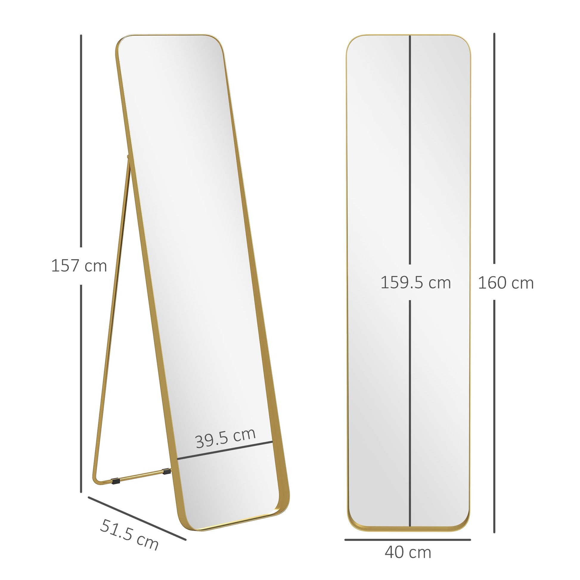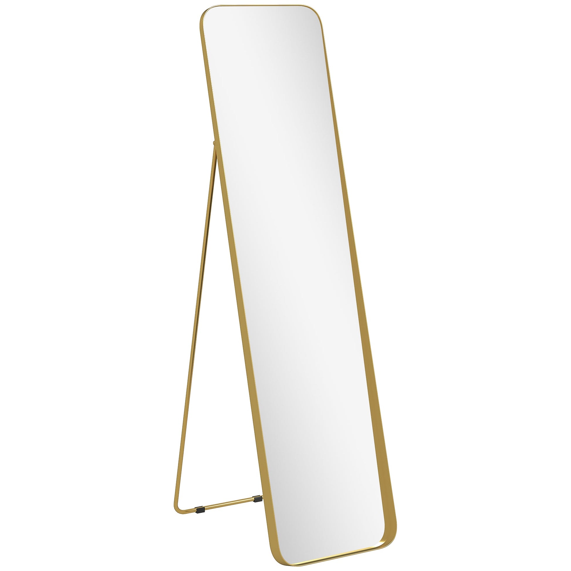 Discover your full reflection with the HOMCOM floor length mirror. Designed to tilt and available as a lean-against-wall or free-standing unit with a bracket, it's great for any space needing a touch of style. This large mirror's curved corners and elegant gold-tone frame enhance any bedroom or dressing area, while the shatterproof high-definition glass ensures safety and clarity.