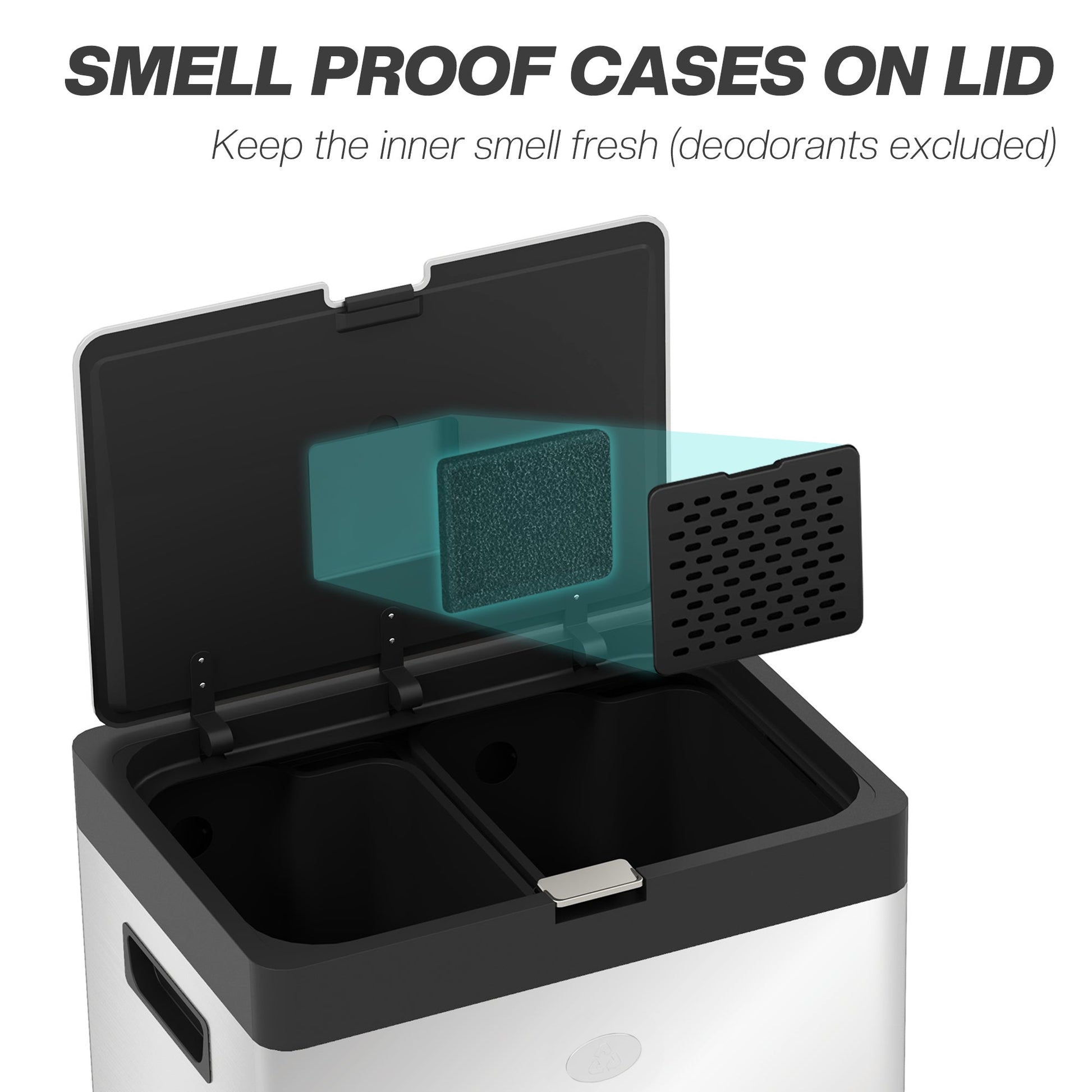 اكتشف سهولة الفرز مع سلة المهملات HOMCOM ذات الغطاء، وهي سلة ثلاثية تتميز بنظام مكون من 3 أقسام (اثنتان بسعة 18 لترًا وواحدة بسعة 20 لترًا) تحافظ على مساحتك مرتبة وتمنع الروائح الكريهة بفضل حامل مزيل الروائح المدمج. يمكنك تحريكها في أي مكان بسهولة بفضل عجلاتها والاستمتاع بلمسة نهائية أنيقة من الفولاذ المقاوم للصدأ ومقاومة لبصمات الأصابع. رائعة لأي مطبخ مزدحم!