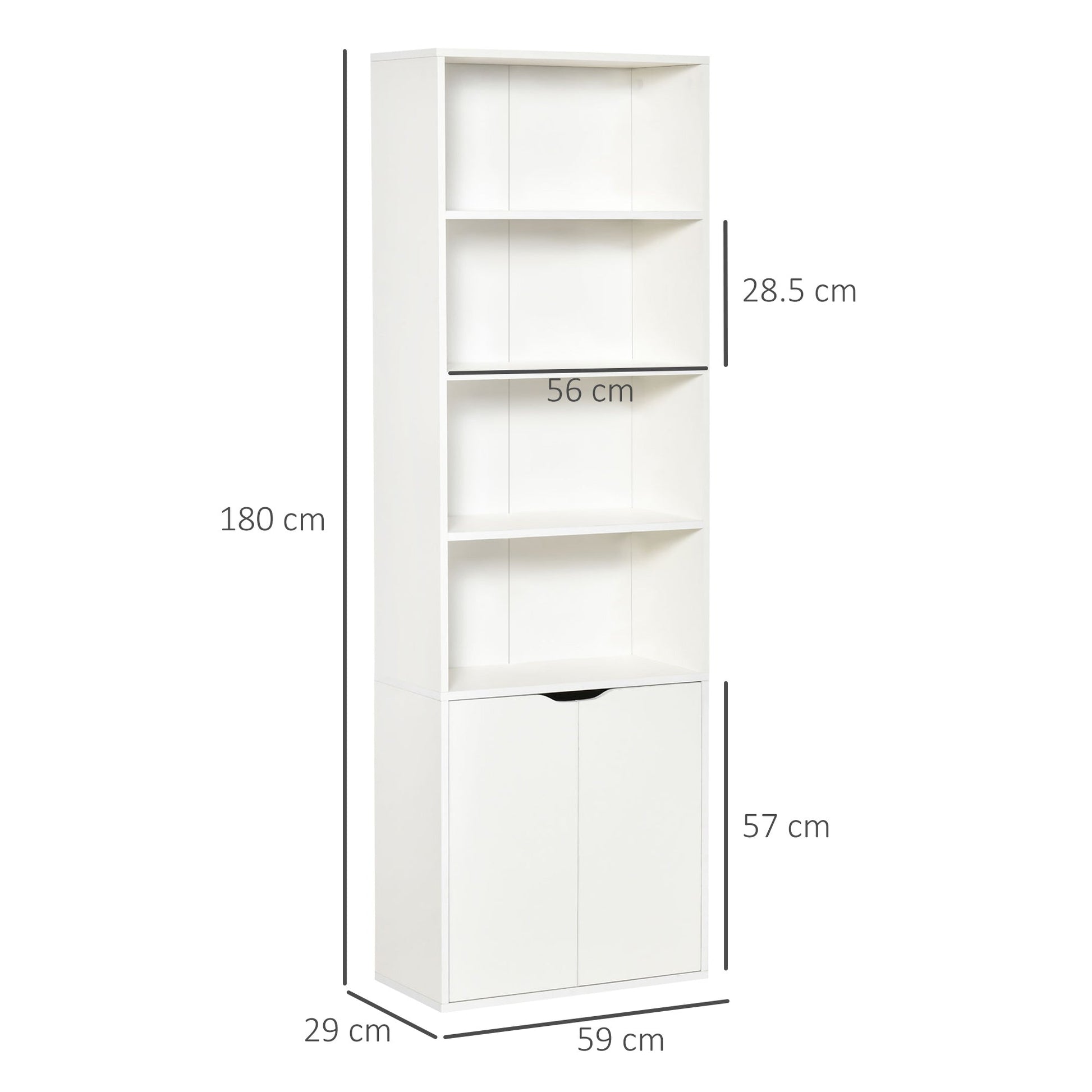 HOMCOM 6-Tier Tall Bookcase, Bookshelf with 4 Open Shelves and Double Door Storage Cabinet, Freestanding Display Rack for Living Room, Bedroom, Home Office, Study, 59 x 29 x 180cm, White