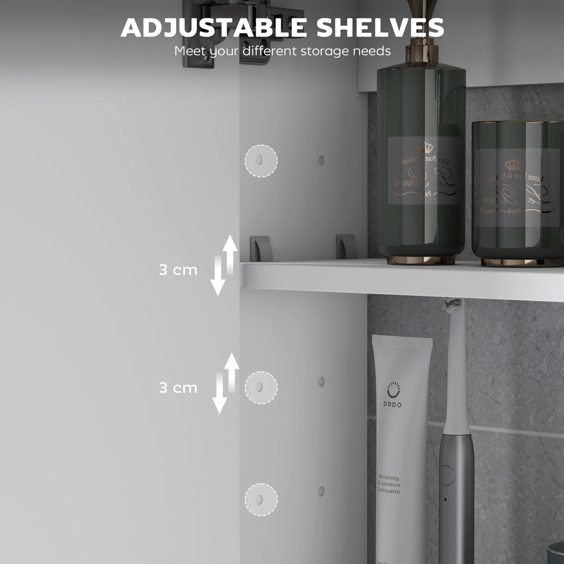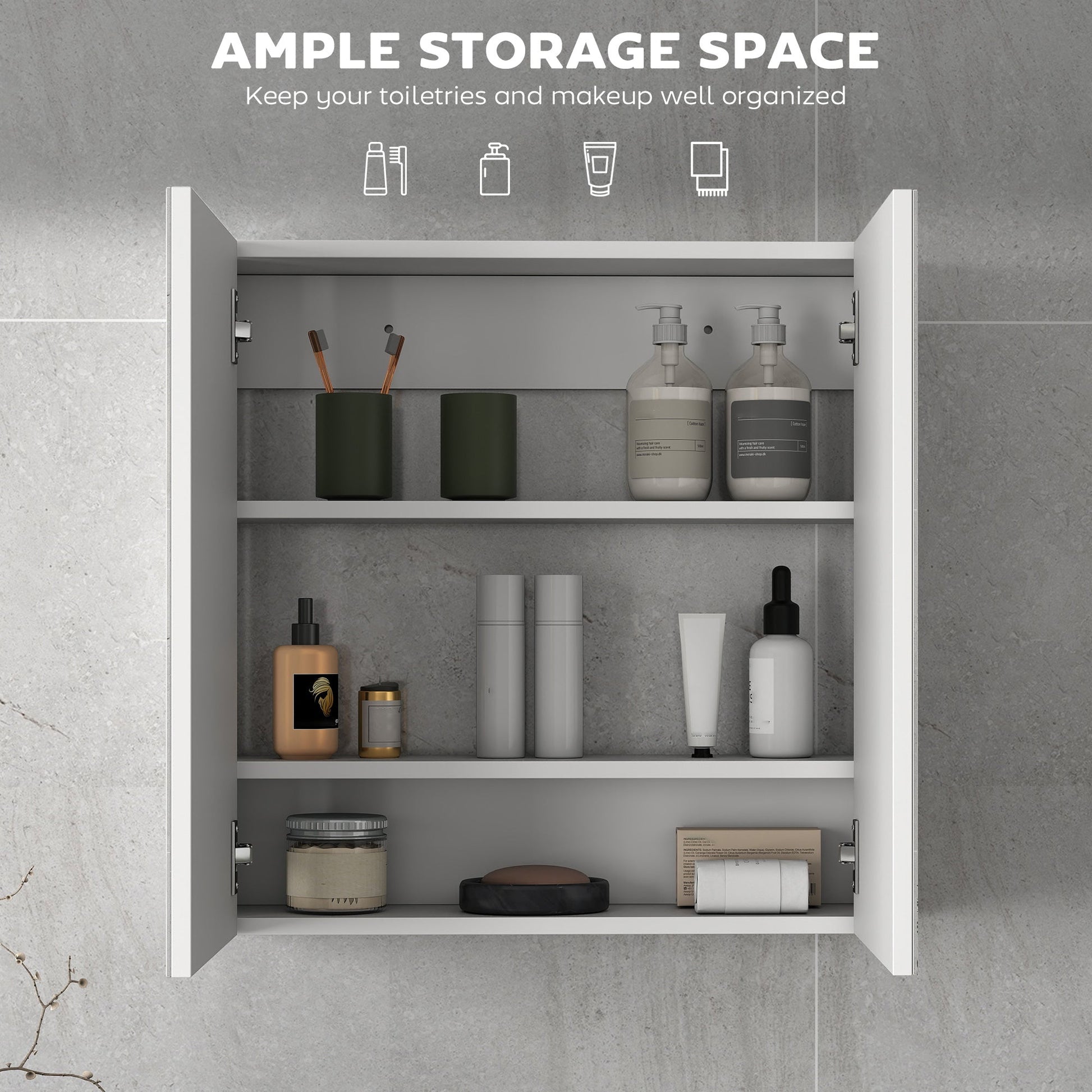 Modern and noble design distinguishes this wall cabinet bathroom mirror from conventional cabinets and will give your bathroom new ambiance. With three inner shelf, including a three-level adjustable shelf, also many wash ware tools can be stored in the cabinet. The cushioned hinges make the door open and close without noise. Don't wait, click and get a modern and usable wall cabinet mirror now!