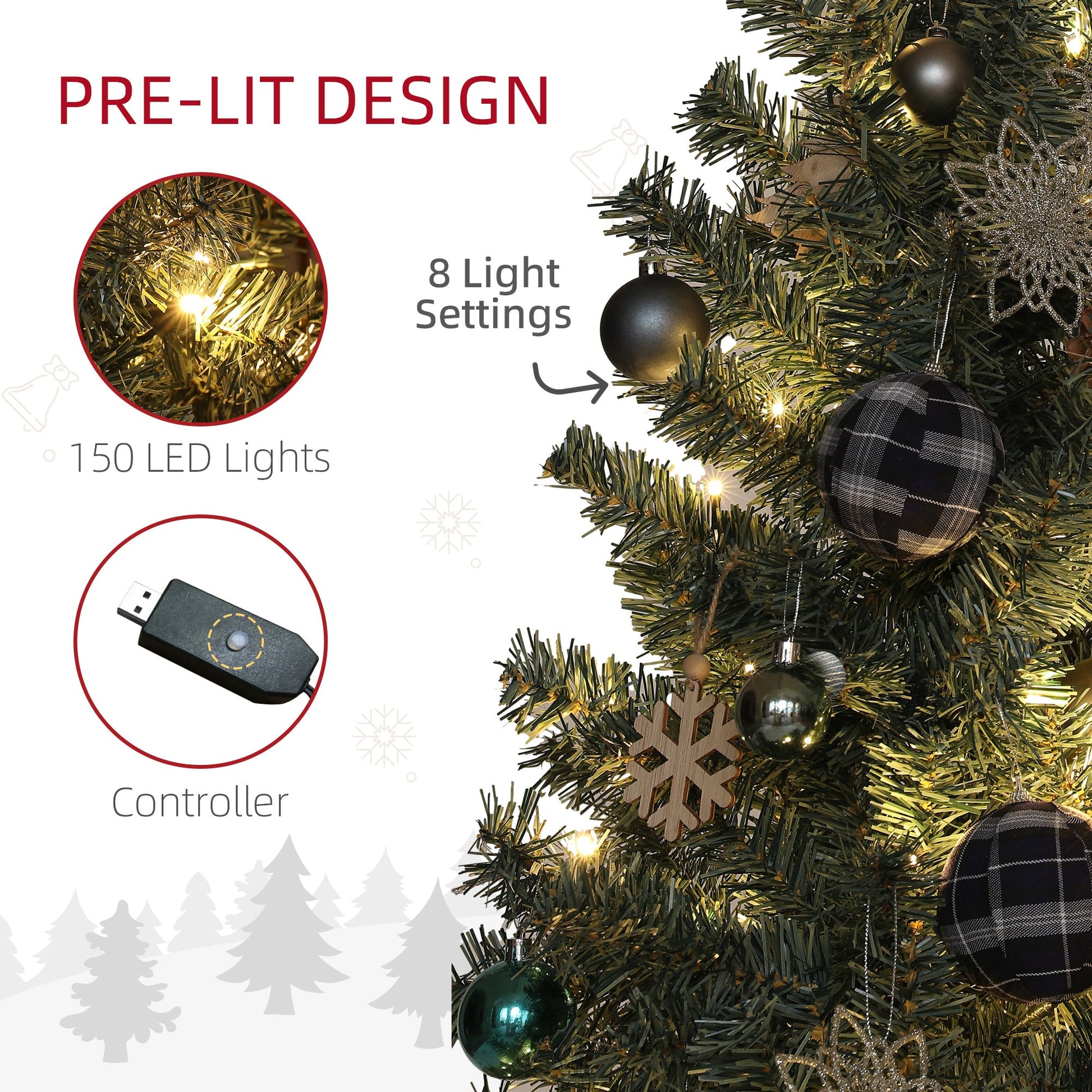Go the extra mile this festive season with this HOMCOM pre-lit christmas tree. Made from flame-retardant plastic, this fake christmas tree is safe for use in your home. The warm white LED lights flick between eight modes, so you can choose the vibe of the illumination to suit you. Equipped with a 'MERRY CHRISTMAS' ribbon, top star, pine cones and decorative balls, this LED Christmas tree adds a sparkle to your celebrations. Complete with a steel base to stand steady.