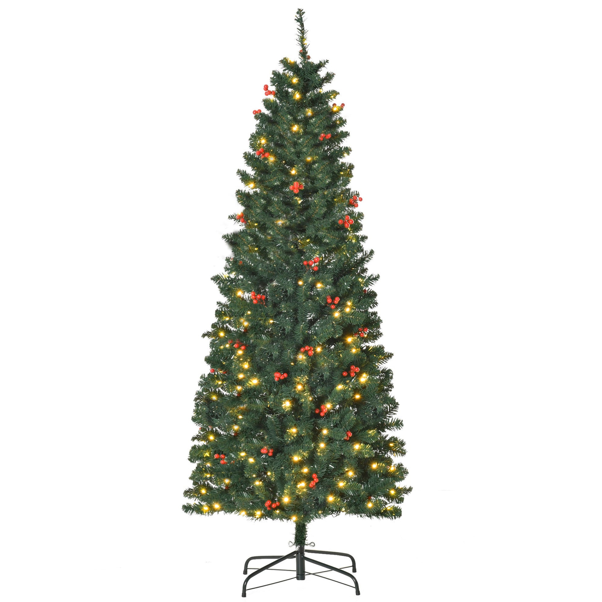 HOMCOM 6FT Prelit Artificial Pencil Christmas Tree with Warm White LED Light, Red Berry, Holiday Home Xmas Decoration, Green