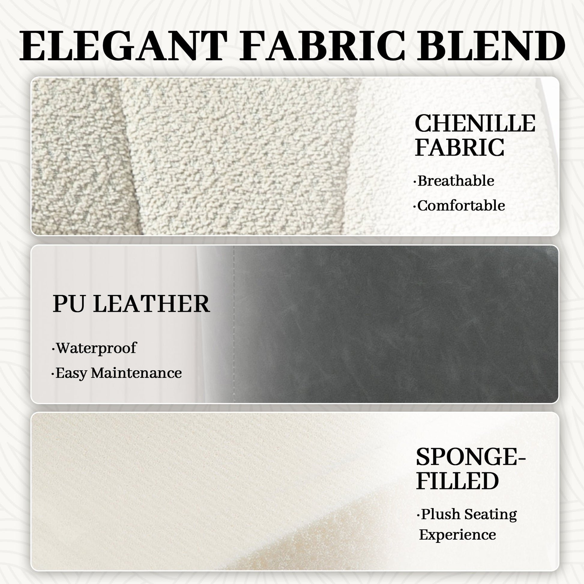 - Material: Chenille (100% Polyester), PU, Sponge, Multi-layered board