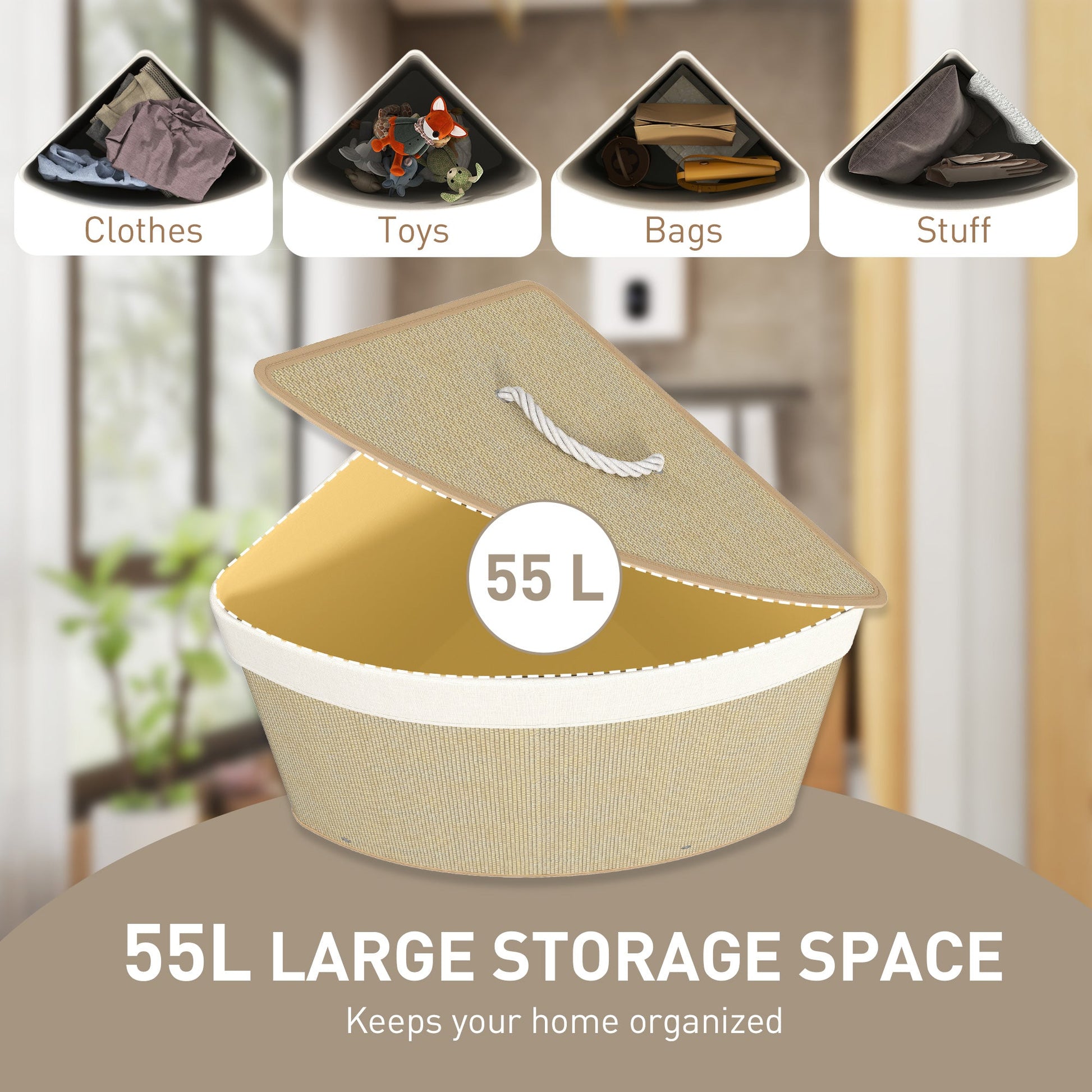 HOMCOM Bamboo Laundry Basket with Lid, 55L Corner Laundry Hamper with Removable Washable Liner Bag, Bathroom Triangle Washing Basket, 35 x 35 x 60 cm, Nature Wood Finish