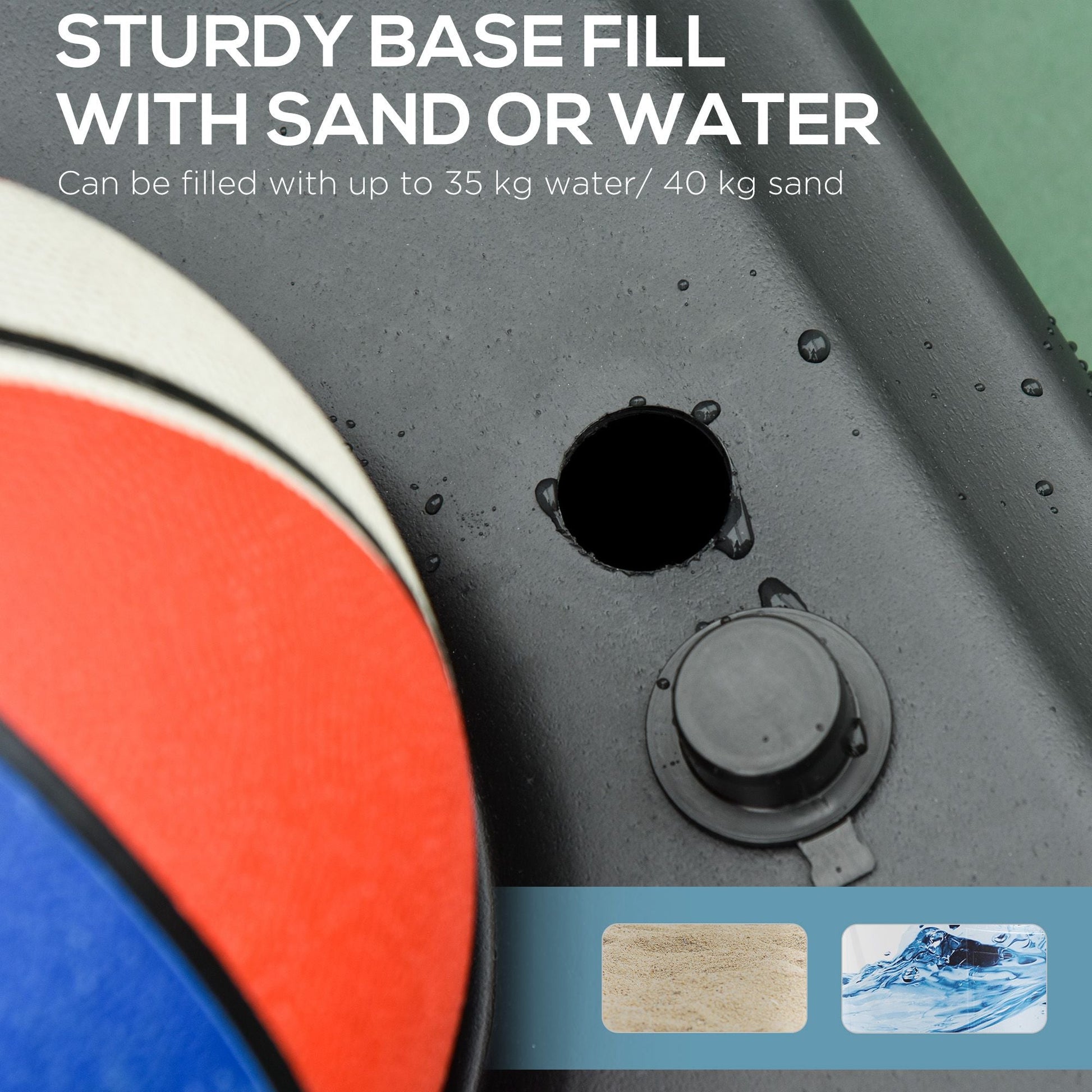 Enjoy shooting hoops with this HOMCOM basketball stand. With an adjustable height, it's suitable for all ages – everyone can join the fun. A steel frame for strength and durability, whilst the base can be filled with water or sand, keeping it firmly in place. Wheels at the bottom lets you move the stand with ease, so you can position it properly. Play on your own or with friends and family; either way, you'll enjoy the swooshing sound of the ball passing through the net.