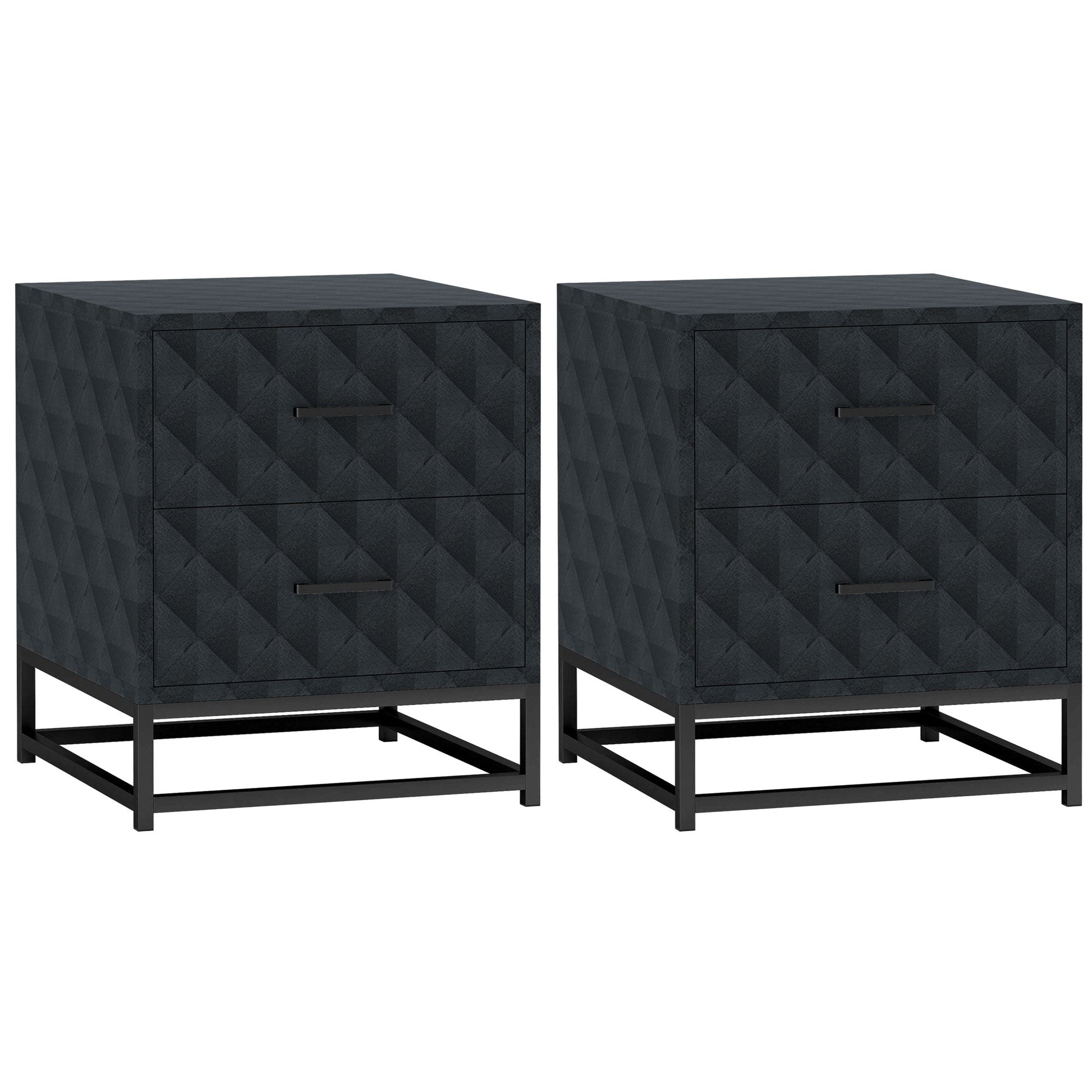 Add a splash of modern minimalism to your bedroom with the HOMCOM small bedside table set. Featuring a chic diamond-patterned veneer atop a sleek black steel frame, these bedroom drawers combine style with functionality. Each end table includes two drawers on smooth alloy rails, providing optimal storage while balancing your bedroom décor effortlessly. This pair fits any contemporary space and is suitable as a small side table or bedside table.