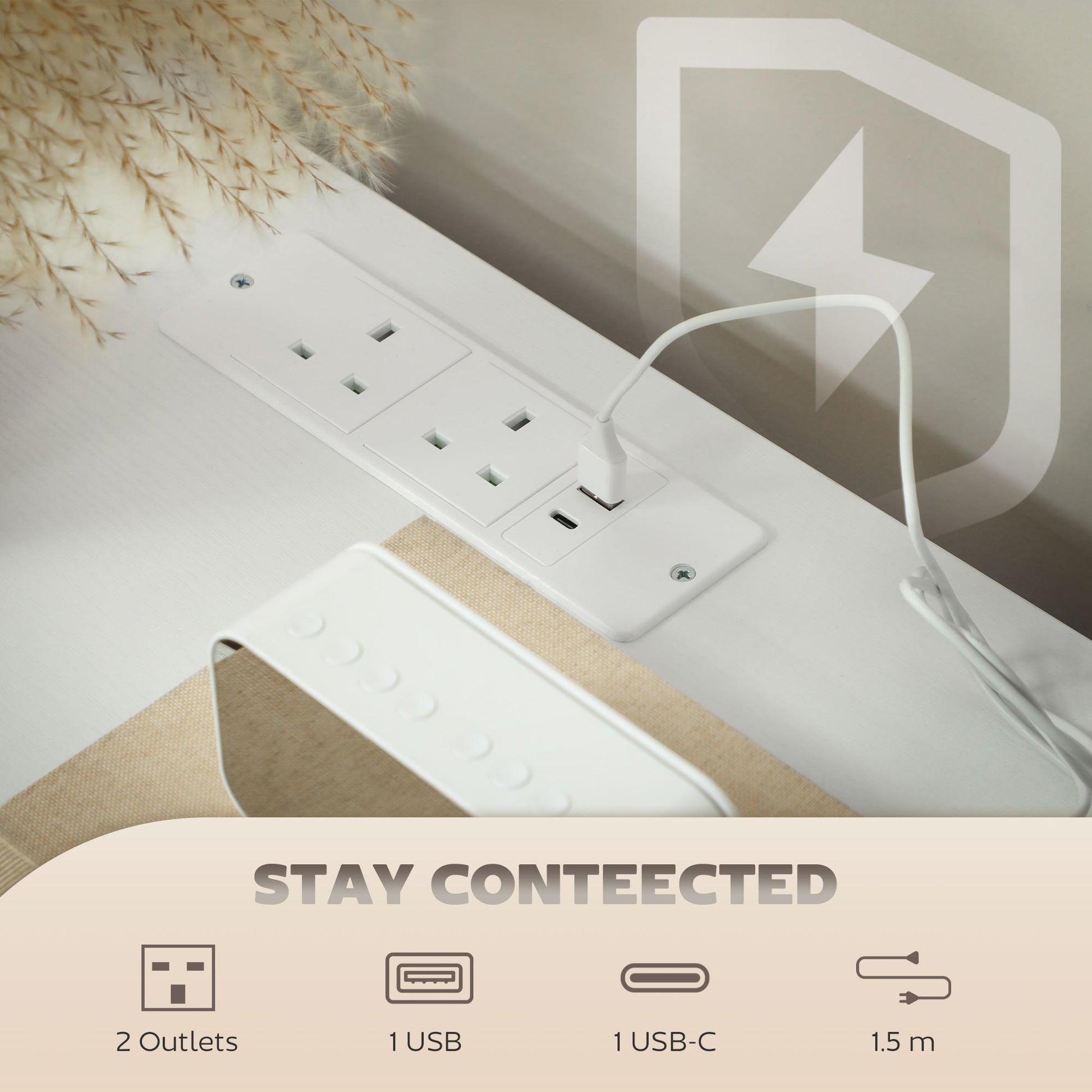- Two power outlets, a USB, a USB-C port charge devices conveniently, with a 1.5-m power cord