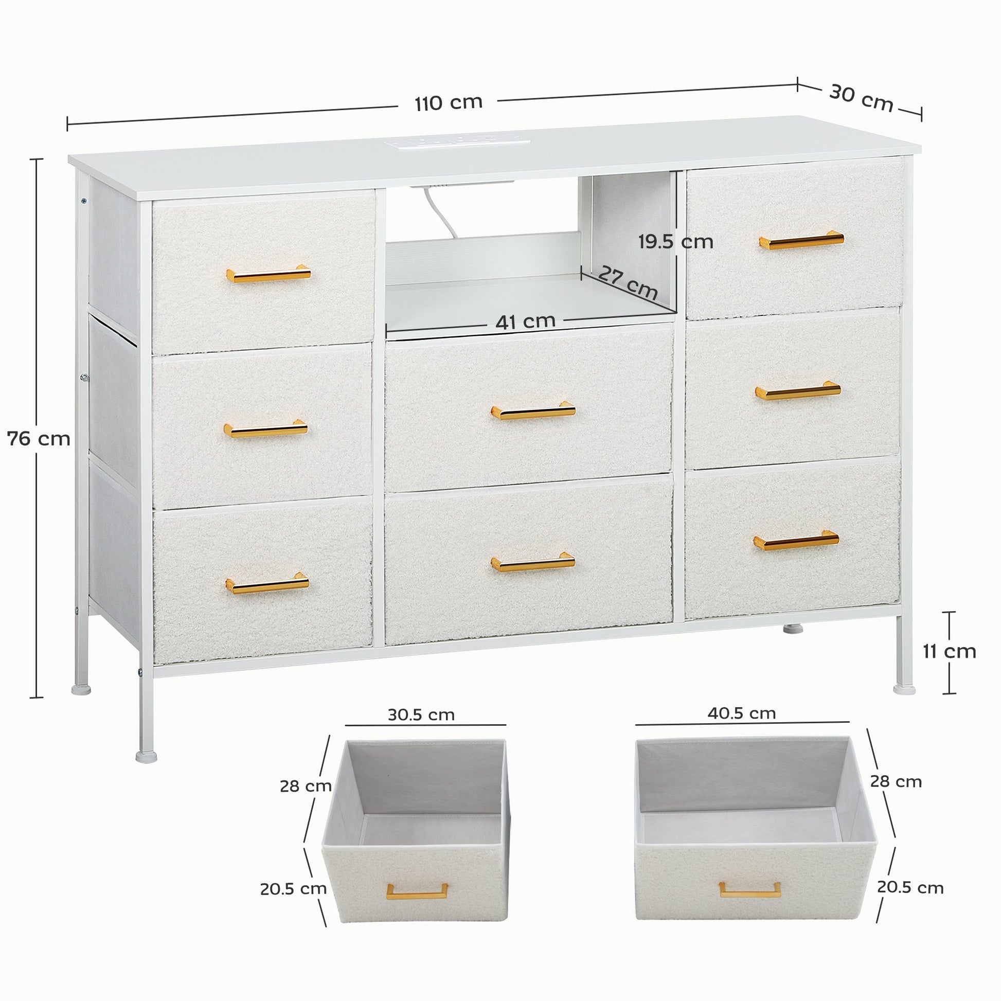 HOMCOM Boucle Chest of Drawers, 8 Fabric Drawers Storage Organiser with Charging Station, 2 USB and 2 AC Ports, Steel Frame, Fabric Dresser for Living Room, Bedroom, Hallway, Cream White
