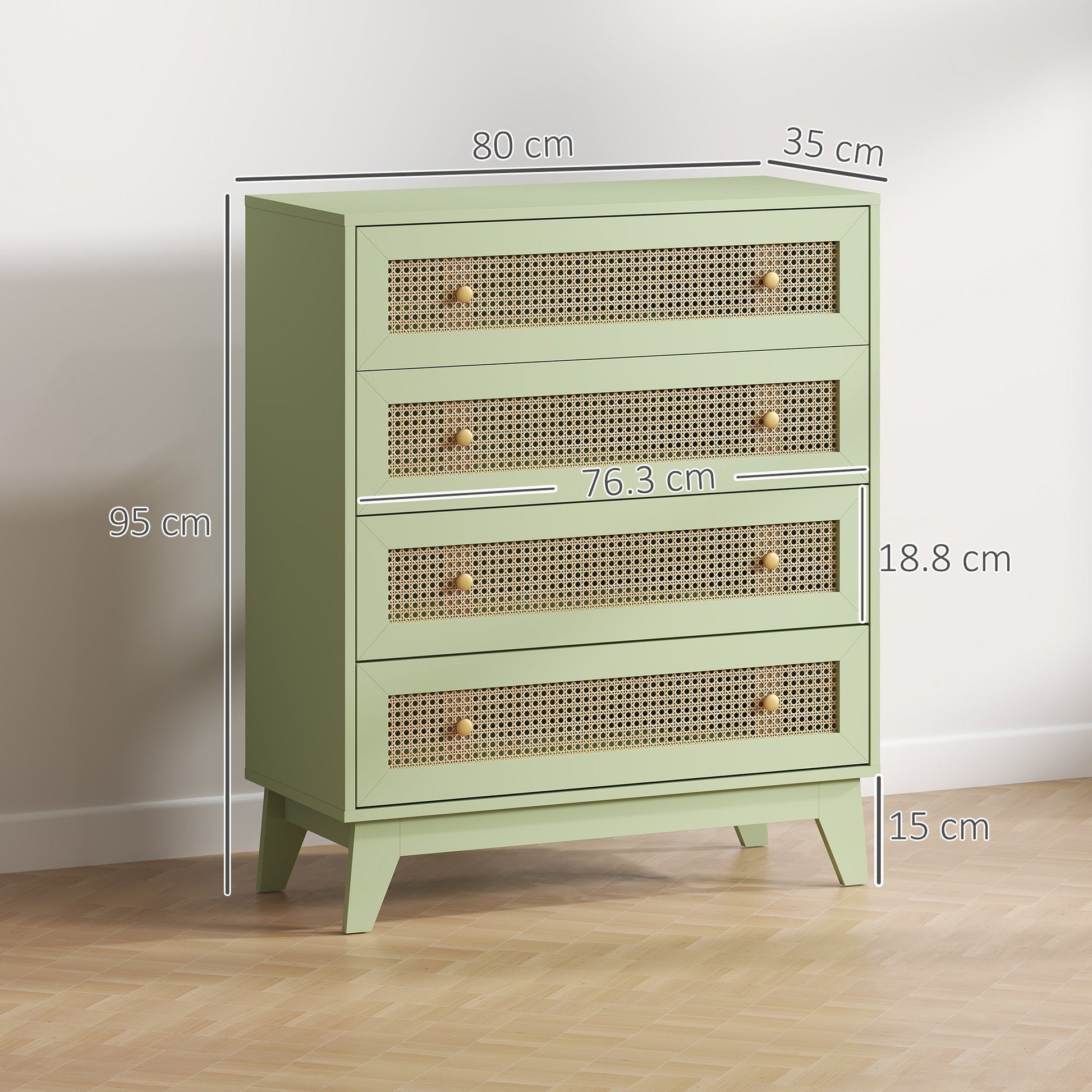 Bedroom drawers, with a subtle difference. This HOMCOM dresser comes with four drawers - each fitted with a middle rattan weave panel; this subtly brings a touch of the outside into your indoor styling. Made from particle board for a strong structure, finished in a light green look natural beauty. The four-legged base provides plenty of support, and this drawer chest comes complete with anti-tipping straps to secure a wall safely.