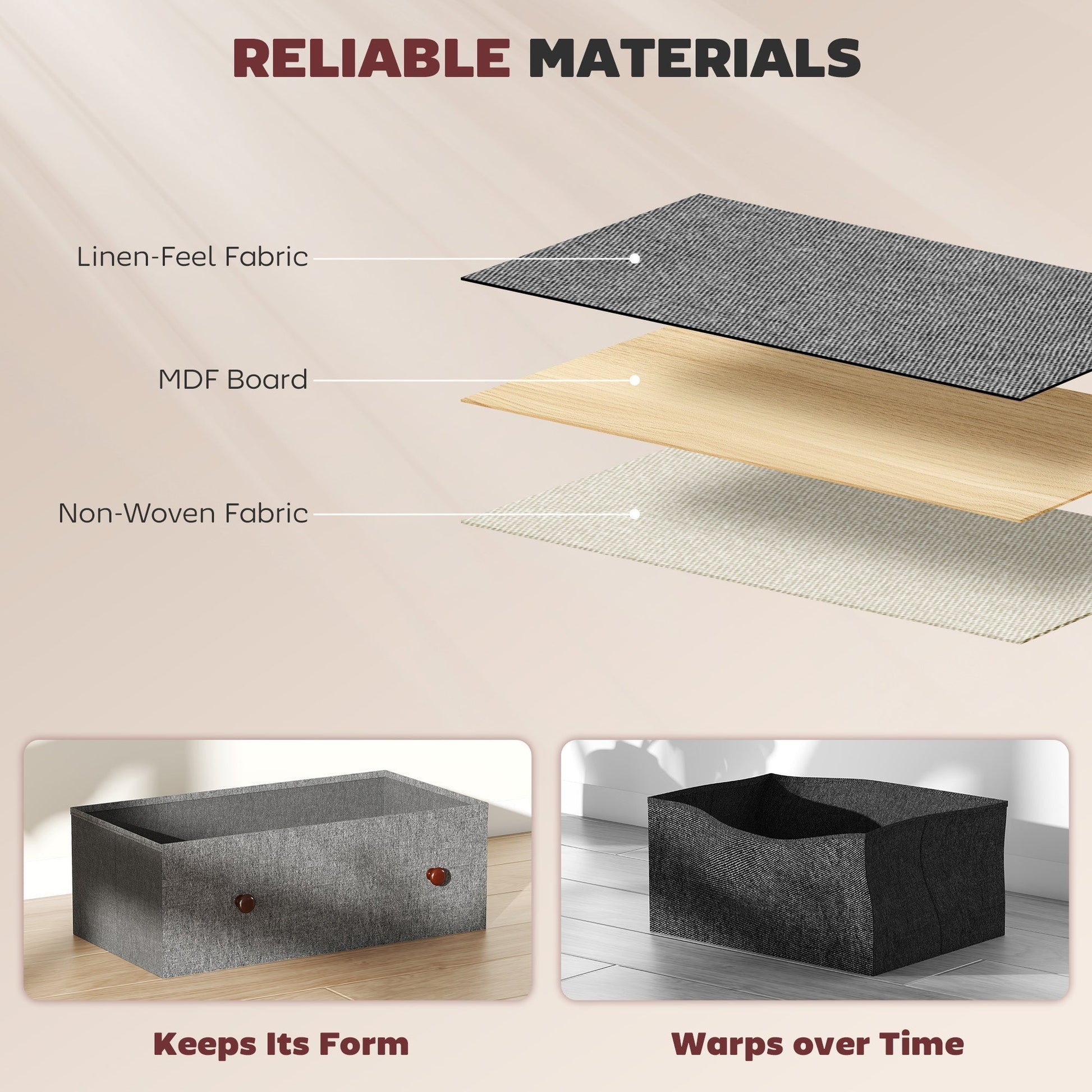- Foldable storage drawers collapse flat when not in use