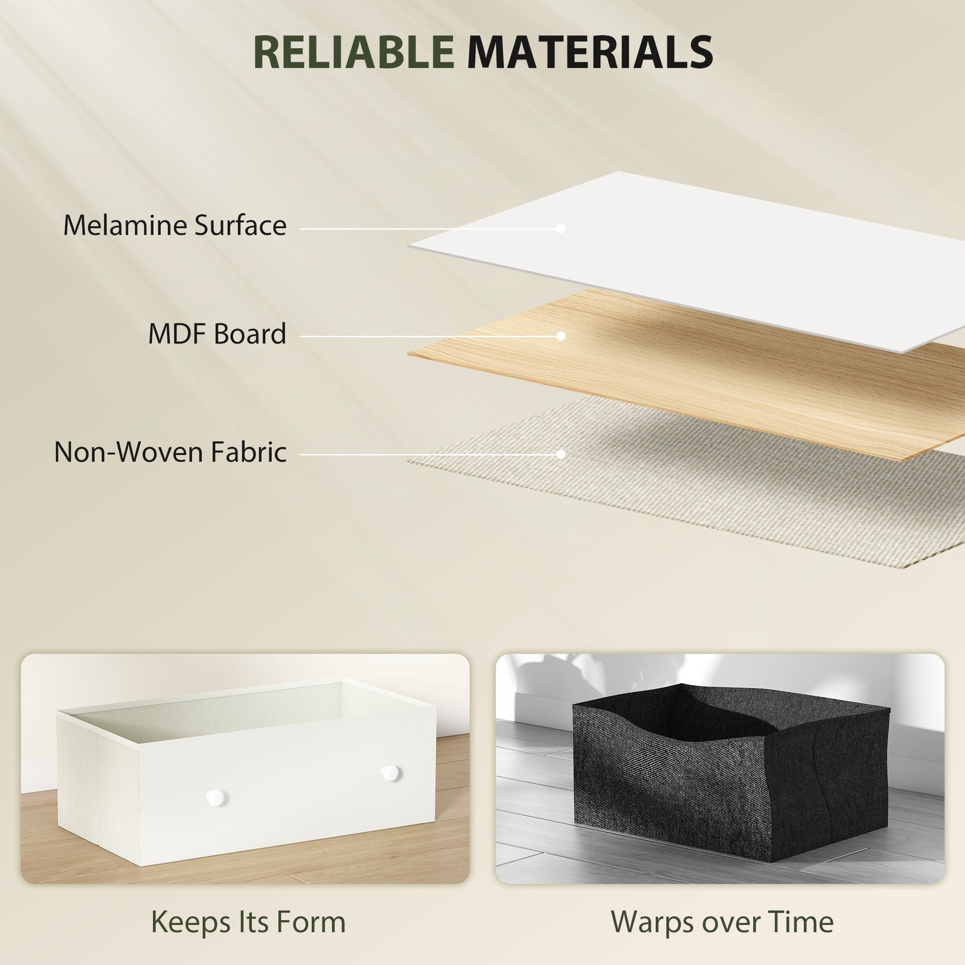 - Foldable storage drawers collapse flat when not in use