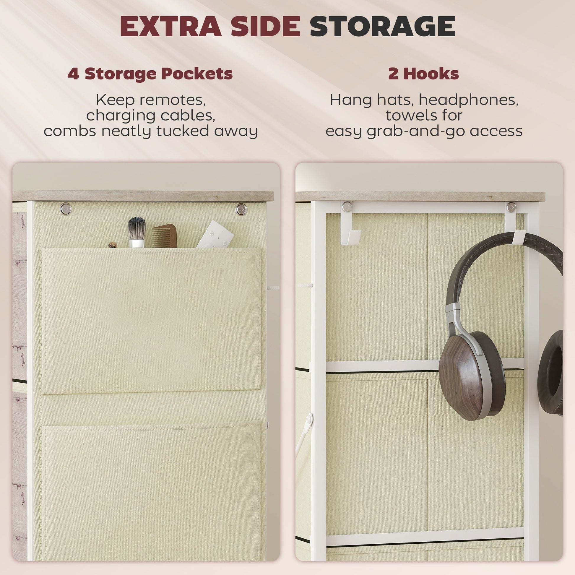 Easy, simple storage with this HOMCOM fabric chest of drawers. With eight same drawers, it's easy to sort everything from socks to pants. It also features four side pockets and two hooks to get smaller accessories altogether. A steel frame with X-bars keeps this bedroom dresser stable, finished with adjustable feet for balance - even on unsteady grounds.