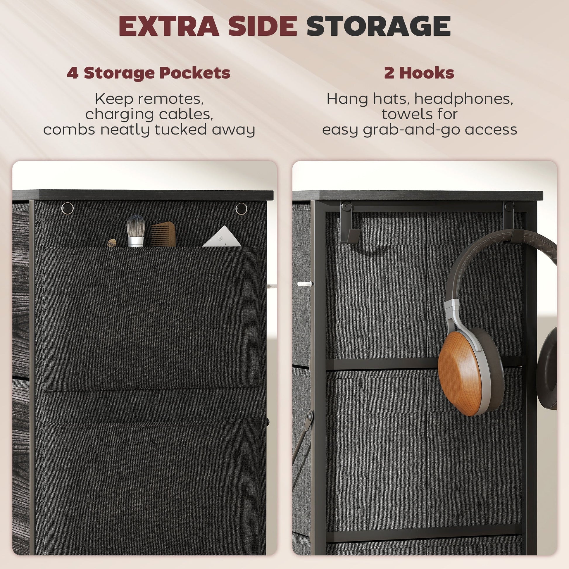 Easy, simple storage with this HOMCOM fabric chest of drawers. With four same drawers, it's easy to sort everything from socks to pants. It also features four side pockets and two hooks to get smaller accessories altogether. A steel frame with X-bars keeps this bedroom dresser stable, finished with adjustable feet for balance - even on unsteady grounds.