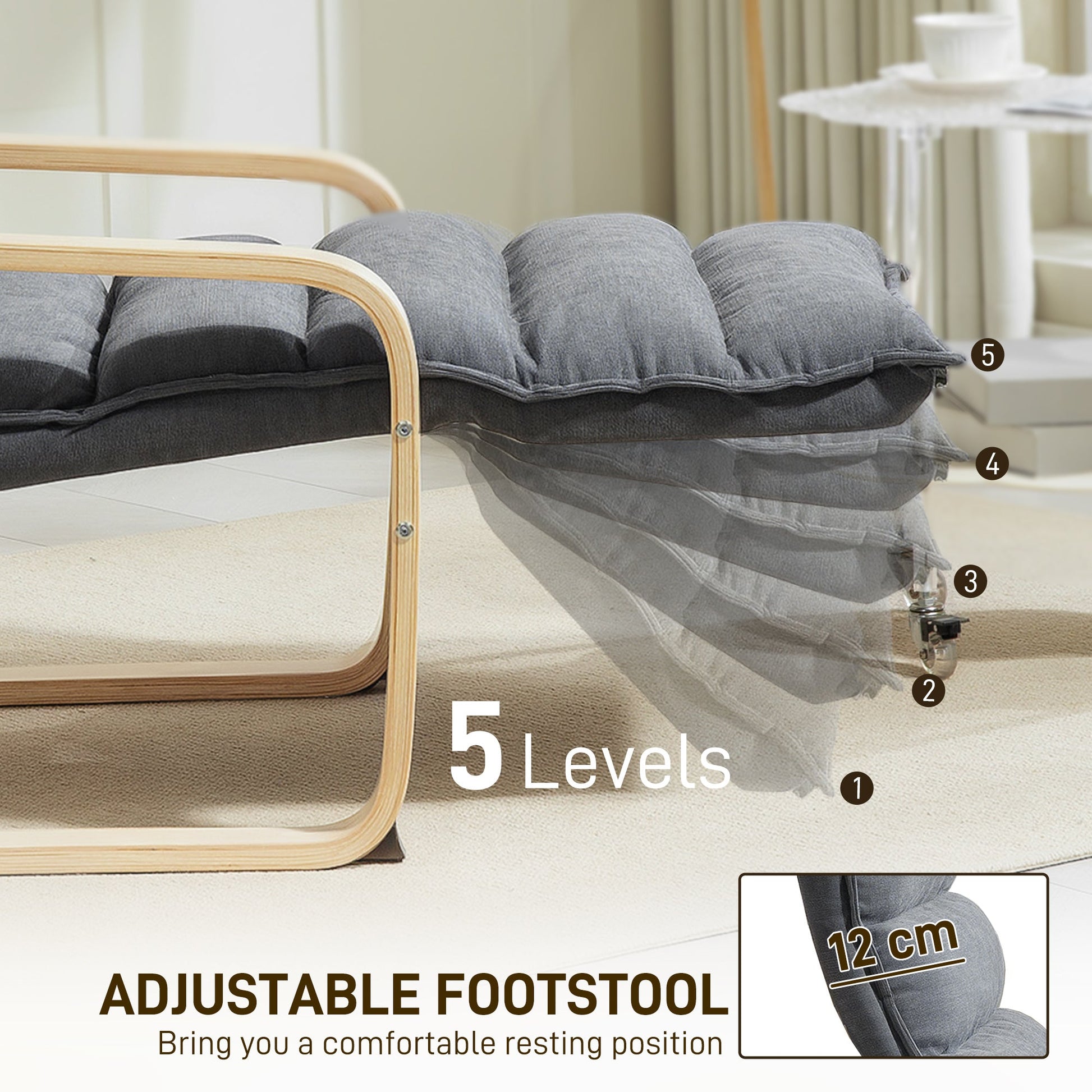- Adjustable footrest with five positions from 0 to 90°. Elevate your lower body how you want