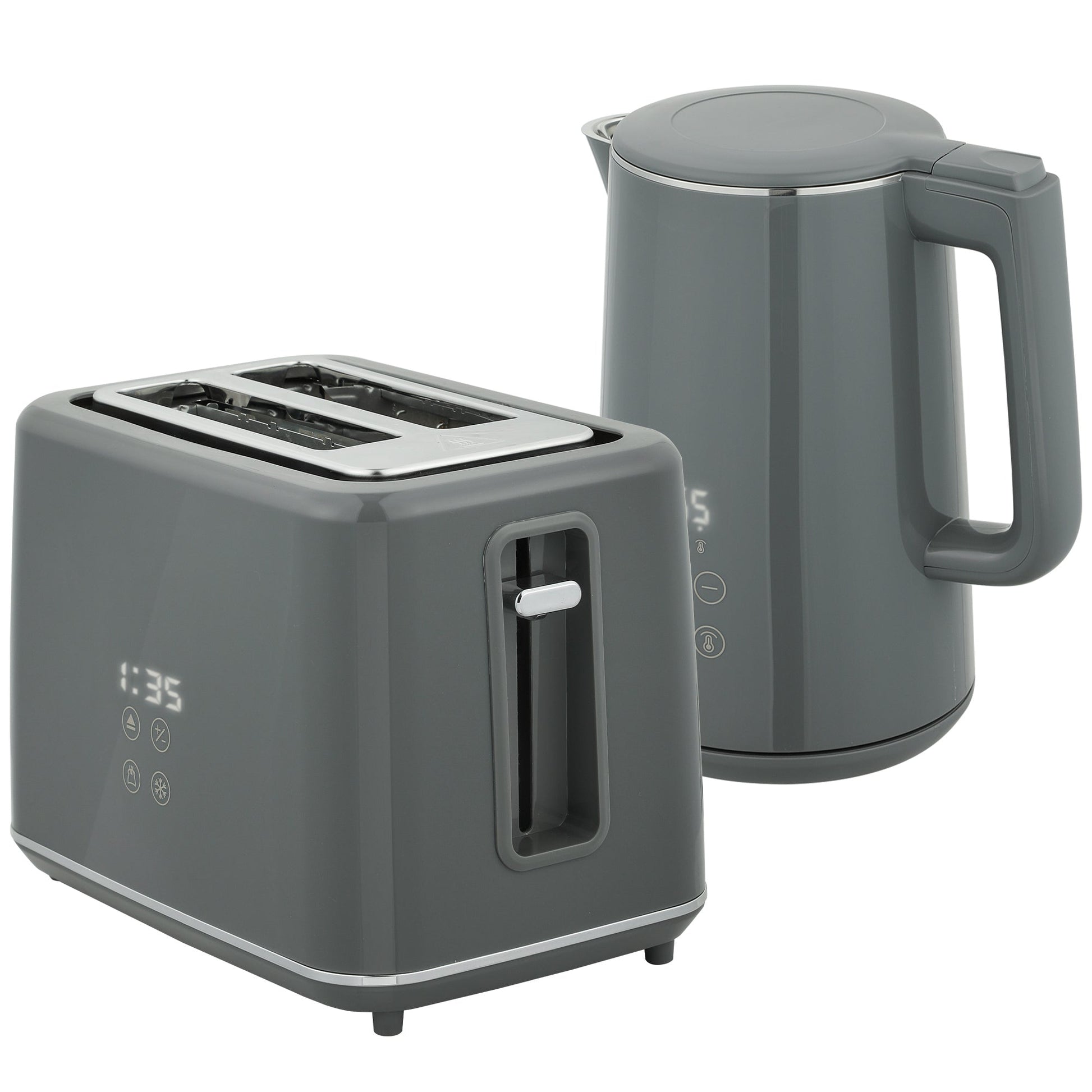 HOMCOM Digital Stainless Steel Kettle and Toaster Set, 1.5L 3000W Fast Boil Kettle, 2 Slice Toaster with 7 Level Browning Controls, Defrost, Reheat, Keep Warm, Crumb Tray and LED Touch Display, Grey