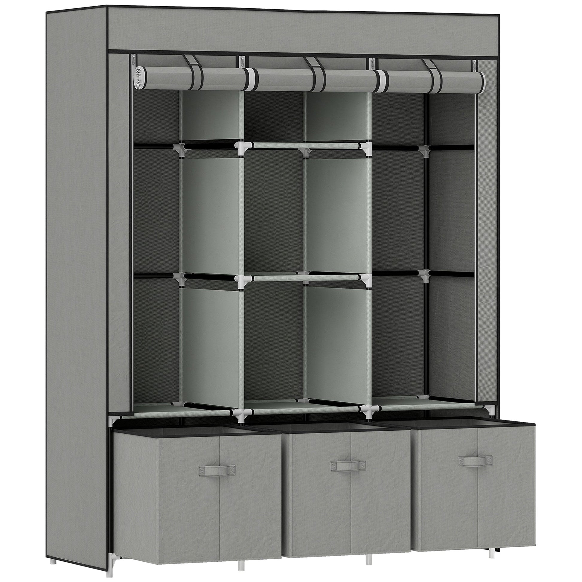 A simple way to keep your clothes organised, this HOMCOM fabric wardrobe is a multi-storage piece, great for practically any home space. It comes with two rod sections, three bottom drawers and five shelves - space for dresses, trousers, tees, shirts - and so much more. The steel frame means a strong, supportive structure, with the fabric cover creating protection from dust and more.