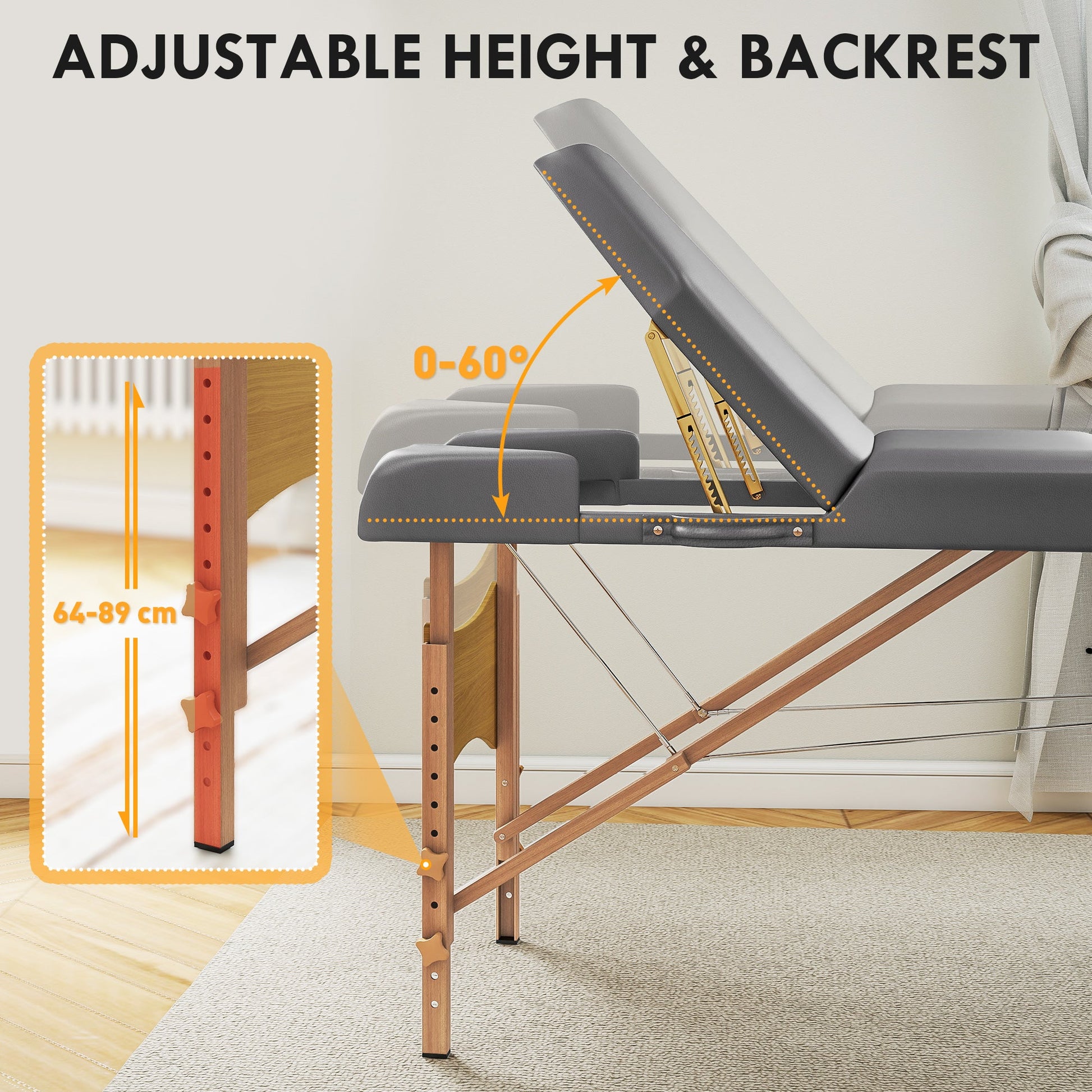 - 64-89 cm six-level height, 0-60 reclining backrest and -90-90 face cradle for flexibility