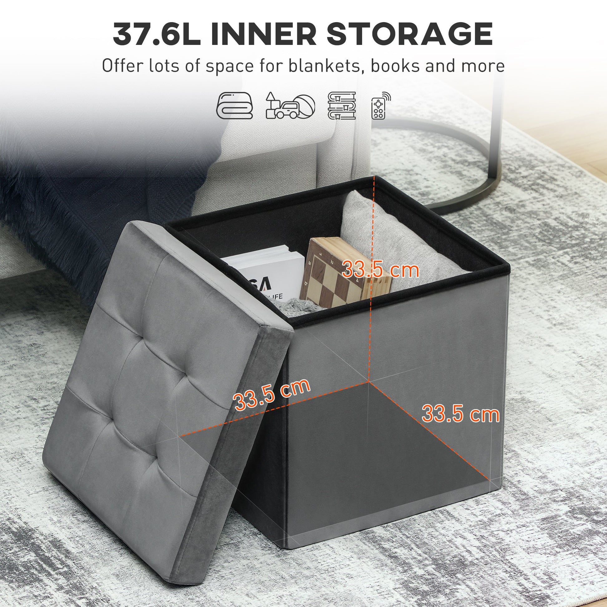 Transform your living space with the HOMCOM storage ottoman. Struggling with clutter in your small flat? This foldable ottoman storage box offers a chic solution, providing a stylish accent while saving space. Sink into its high-density foam and soft-touch velvet-feel fabric, turning stress into relaxation. Enjoy a clutter-free space and elevate your home's comfort and style effortlessly.