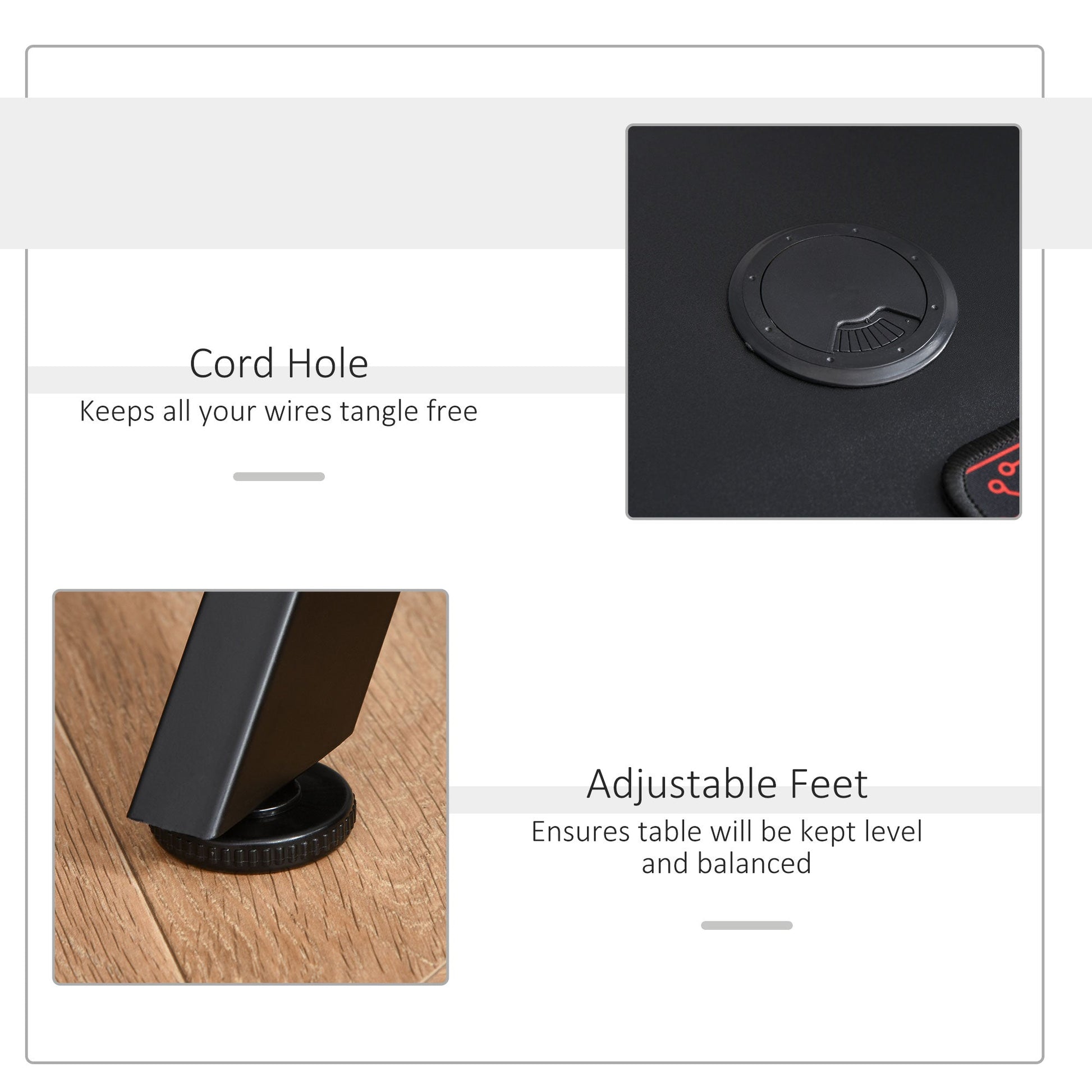 Make your gaming time extra fun with this HOMCOM stylish PC desk for gaming. It features a large main worktop, a cup holder and a headphone hanging hook, giving you everything you need in a spacious spot - meaning you won't have to move in the midst of a game. The adjustable feet ensure the gaming PC desk keeping level at all times. The perfect piece for your home gaming haven.