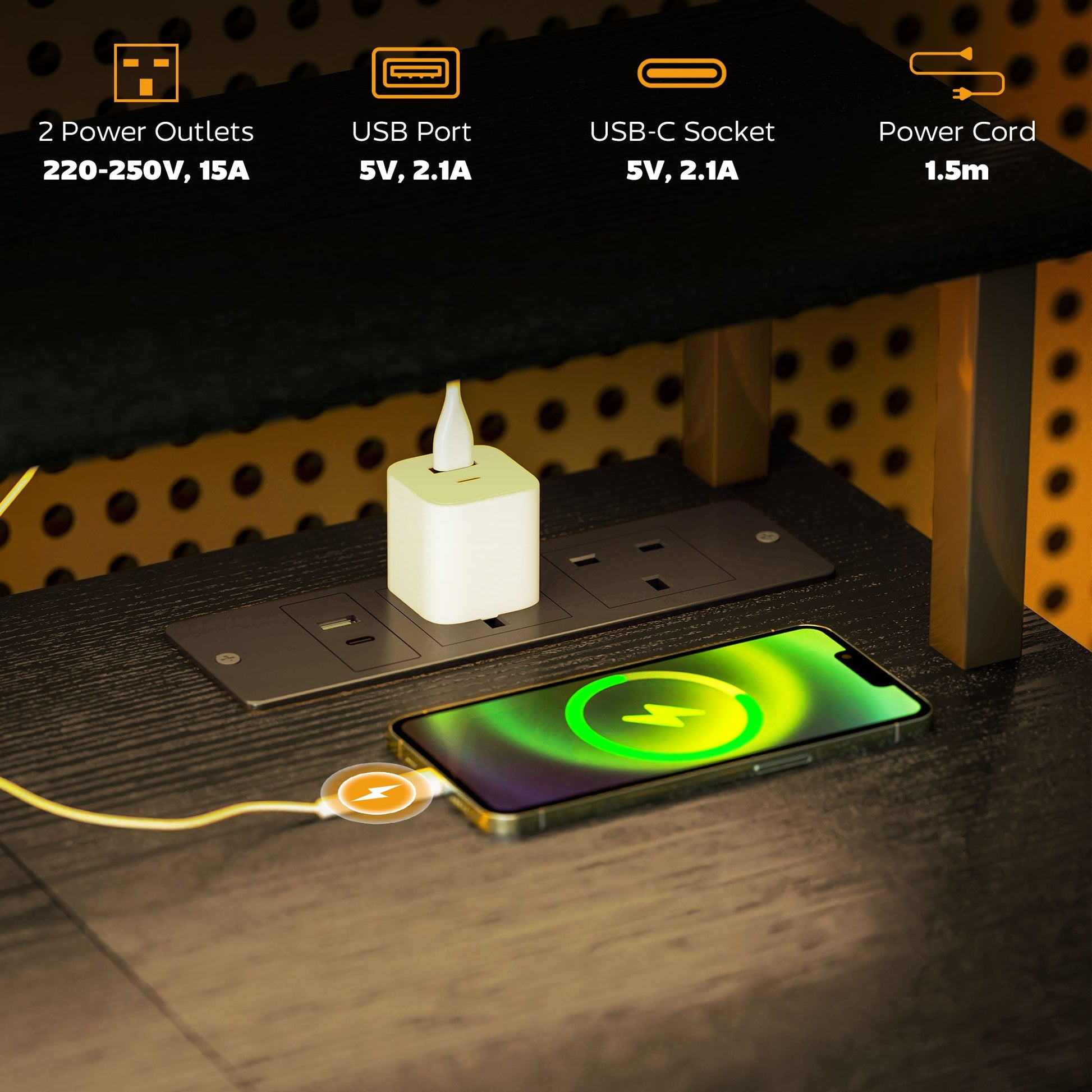 - Charging station with two UK plug sockets, a USB port and a USB-C socket